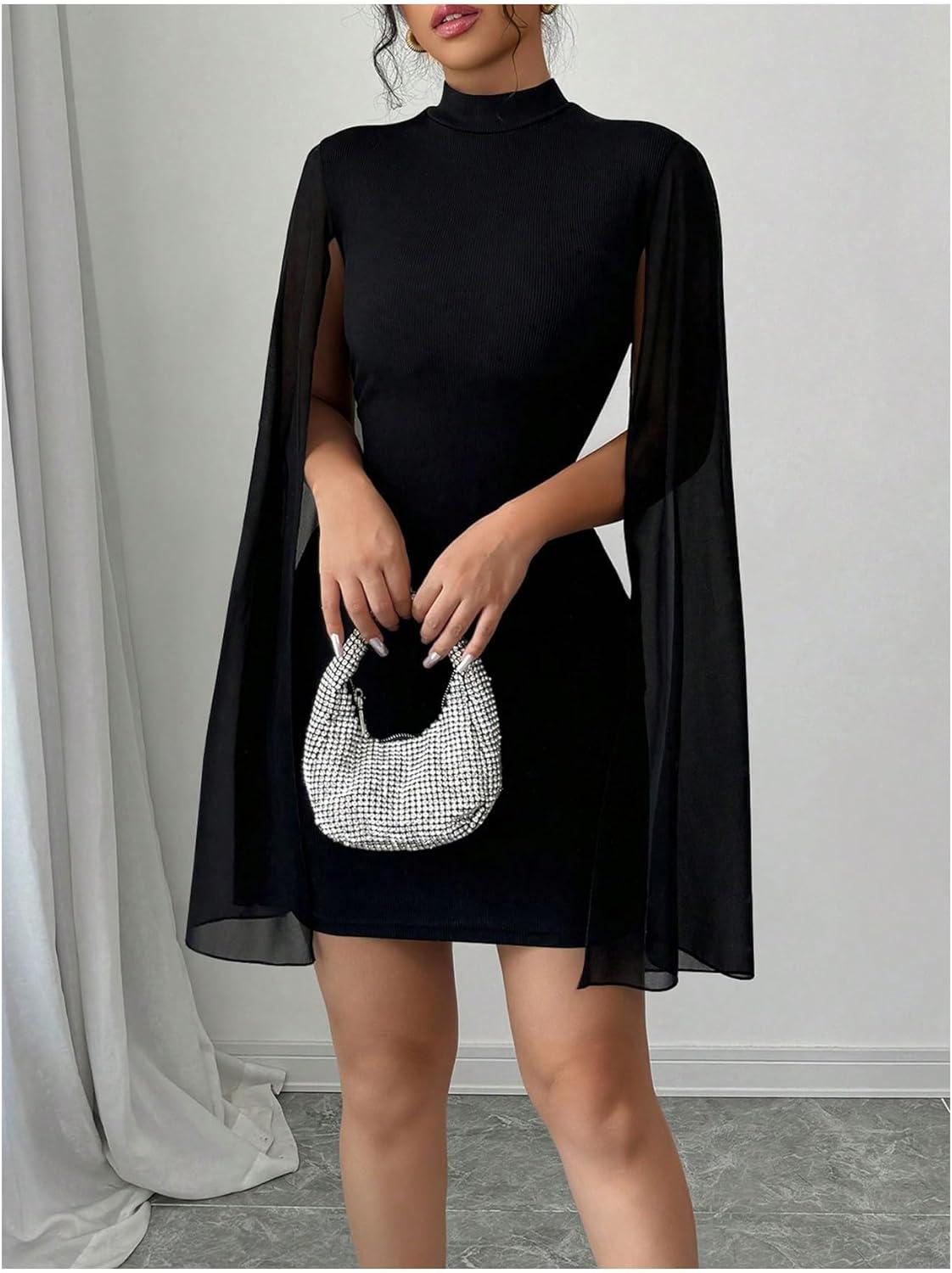 The cut is clever: a fitted bodice and waist skim your curves while the mock neck and shimmering fabric draw the eye upward, giving you a longer, more balanced silhouette. The mini hemline lengthens your legs, especially when paired with heels or ankle boots, while the cloak/bell sleeves add movement without adding bulk at the hips — so your natural waist reads narrower and your shoulders appear softly framed rather than boxy.Because the fabric has a bit of stretch and a close fit through the torso, it hugs where you want it to and skims where you don’t, letting the sparkle highlight shape instead of overwhelming it.