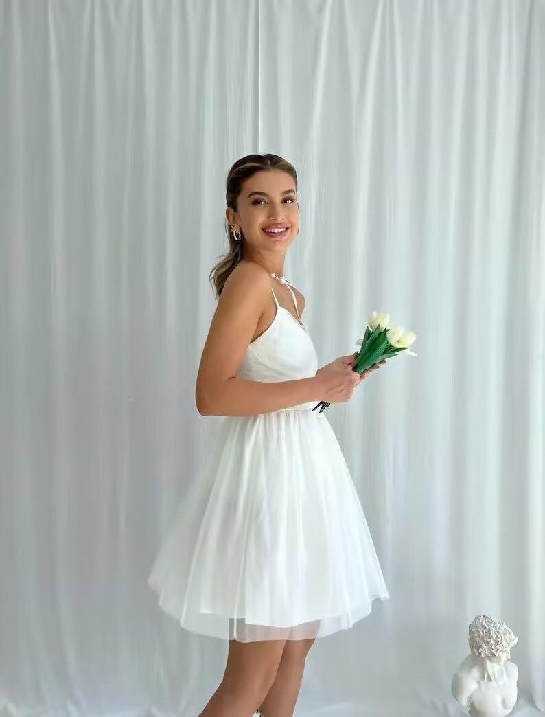 A‌ first look at the short tulle ‌homecoming dress ‌with spaghetti straps as it sits⁣ on ‍you