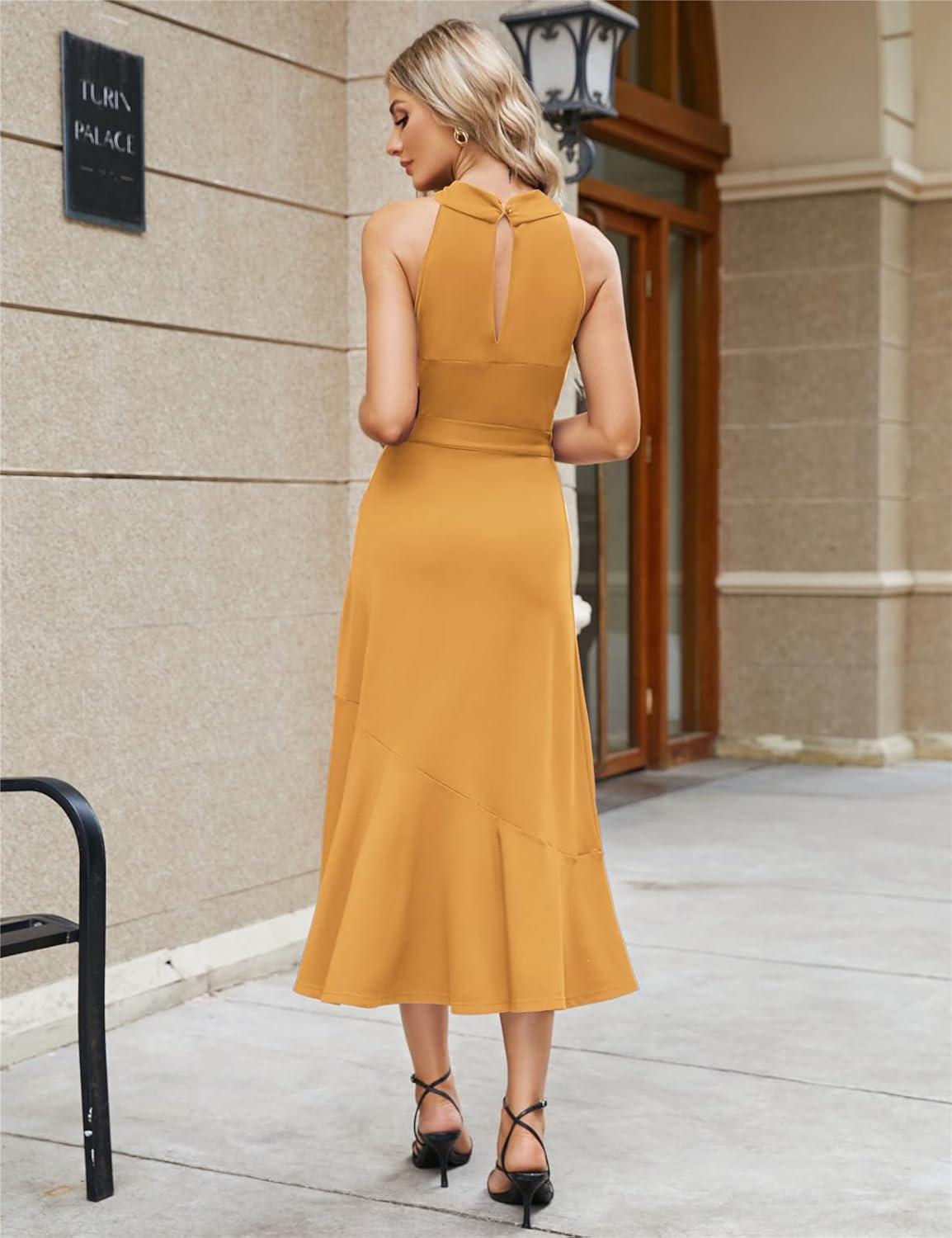 we found this dress to be a stunning option for the cooler seasons, expertly blending elegance with current trends. The midi length offers just the right amount of coverage for fall, while the crisscross neckline adds a modern twist to its classic silhouette. Crafted without sleeves, it encourages layering with jackets or shawls, making it versatile for day-to-night transitions. The ruffle hem adds a subtle flirty detail that elevates the overall design, and the included belt cinches the waist to flatter different body types. It’s effortlessly stylish for cocktail parties, gatherings, or even a smart casual day out.