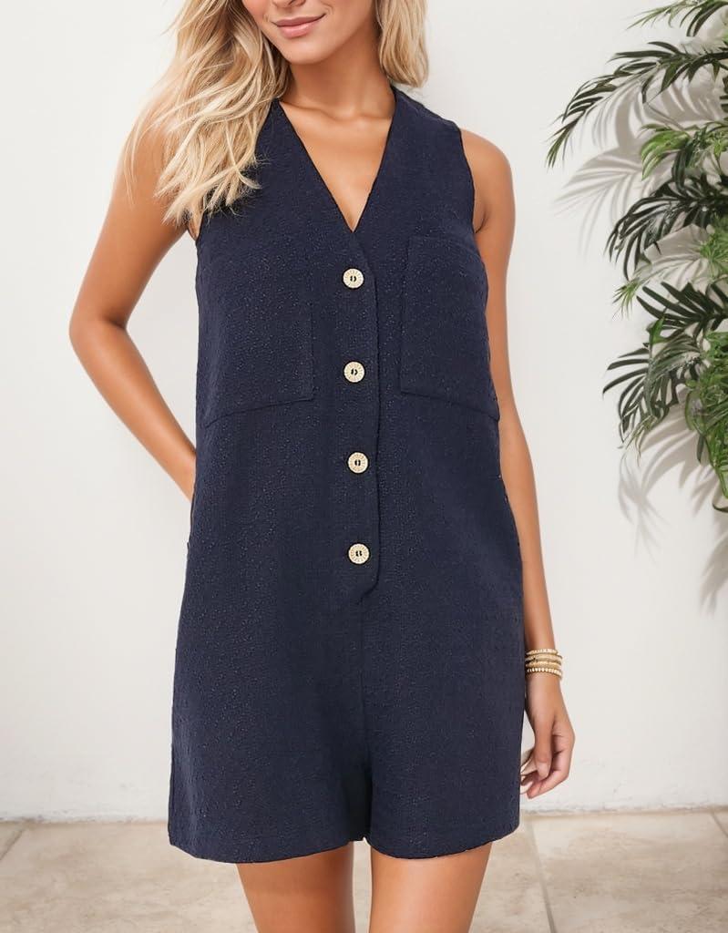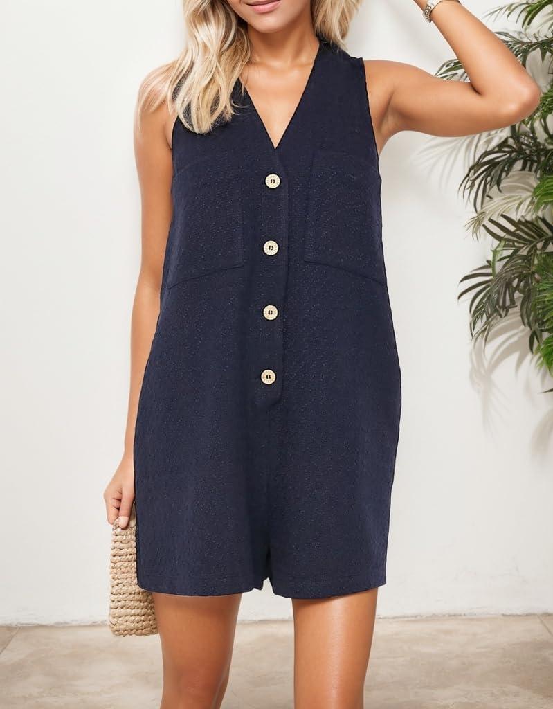This sleeveless romper offers a perfect blend of elegance and casual comfort, crafted from soft, breathable fabric ideal for warm summer days.Its button-down front adds a classic touch while allowing for easy adjustment, and the V-neckline enhances a flattering silhouette. Practicality meets style with thoughtfully designed side and front pockets, providing convenient storage for small essentials without compromising the chic look.