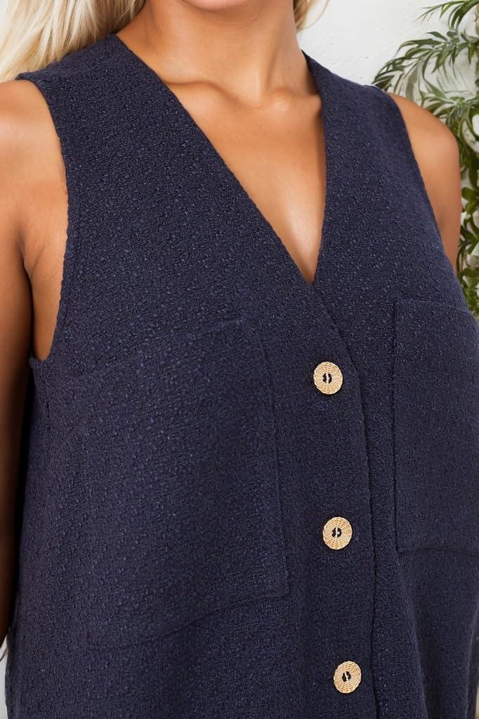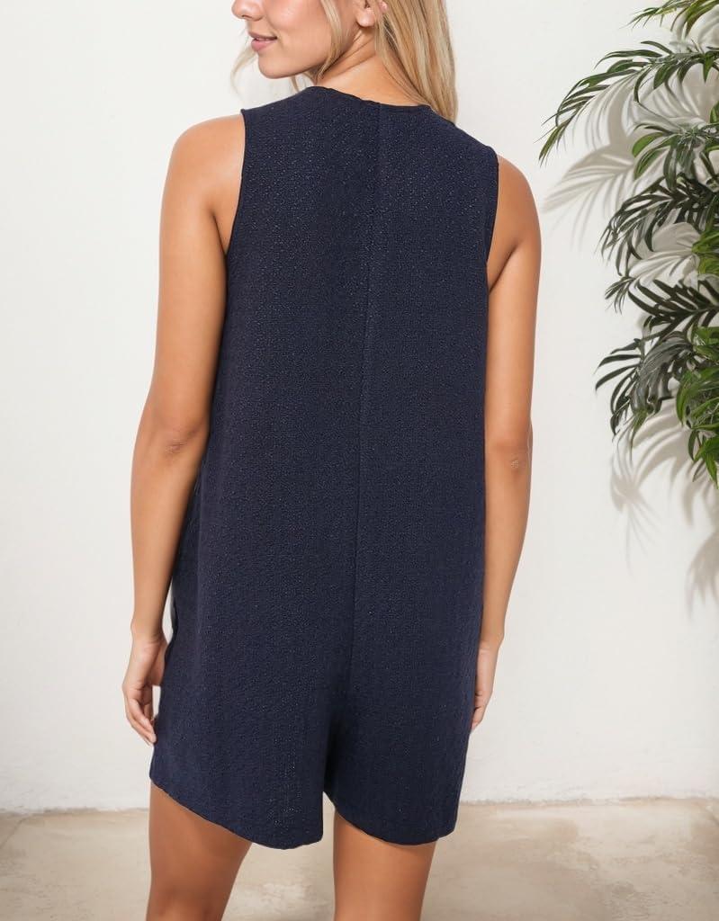 What truly catches our eye is the expertly crafted button-down front, which not only adds a touch of classic sophistication but also allows for adjustable comfort and style. The sleeveless cut enhances breathability, making it an ideal pick for hot summer days while maintaining an elegant silhouette. The subtle tweed texture effortlessly elevates this romper from casual to chic, offering a unique blend of softness and durability rarely found in summer wear. Its V-neckline flatters the neckline beautifully, lending an elongating effect without appearing too formal.