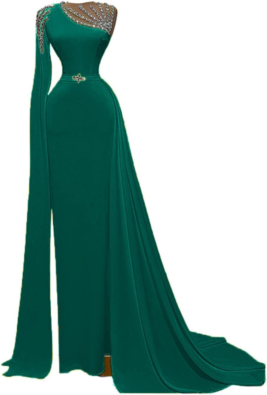 When you’re standing in a crowded room the dress reads as much by movement as by stillness: the crystals pick up stray glances and throw flecks of light as you shift your weight, while the high neckline and fitted bodice keep their shape so it feels like the silhouette stays defined even when you linger in one spot. You find yourself smoothing the skirt with an absent-minded hand now and then; the sweep train quietly brushes the floor and, when you walk across carpet or tile, there’s a gentle tug at the hem that makes shorter, careful steps more natural. It tends to sit quite close through the hip and thigh, so transitions from standing to walking happen in small, deliberate motions rather than long strides.