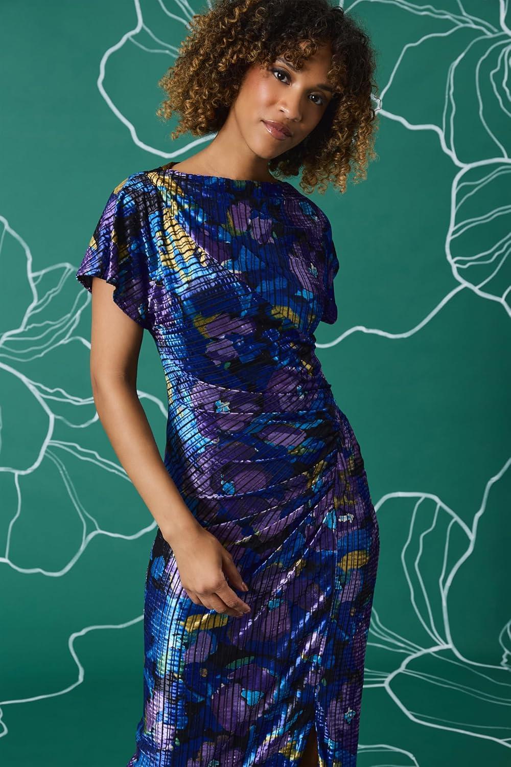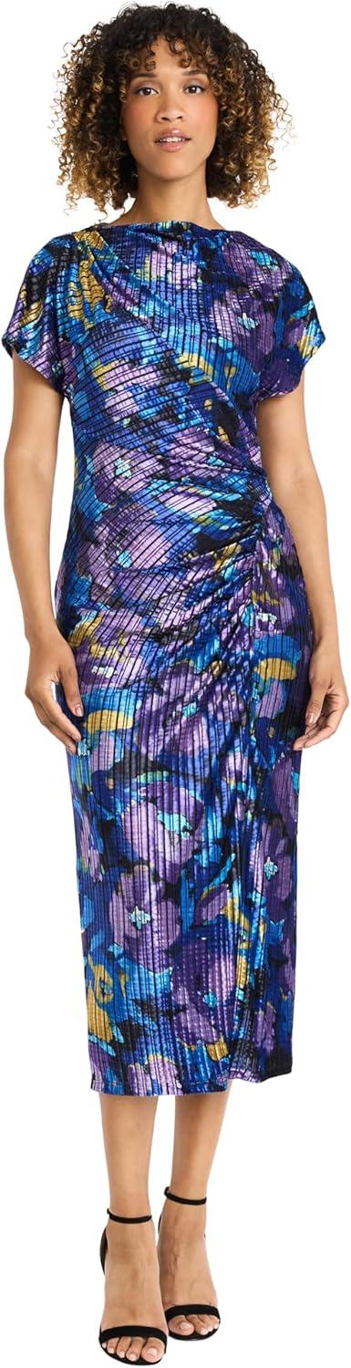 The first thing you notice when you slip into Maggy London’s Short-Sleeved Draped midi Dress is the velvet stripe against yoru skin — a soft, slightly cool texture that has enough weight to feel substantial without weighing you down. As you walk, the drape skims over your hips and the fabric responds with a slow, graceful swing; when you sit the seams settle and you feel the dress tuck itself rather than bunch. The short sleeves hold a modest line at the shoulder and the skirt falls with a muted sheen, catching light in bands as you move, giving the whole piece a quietly intentional presence.
