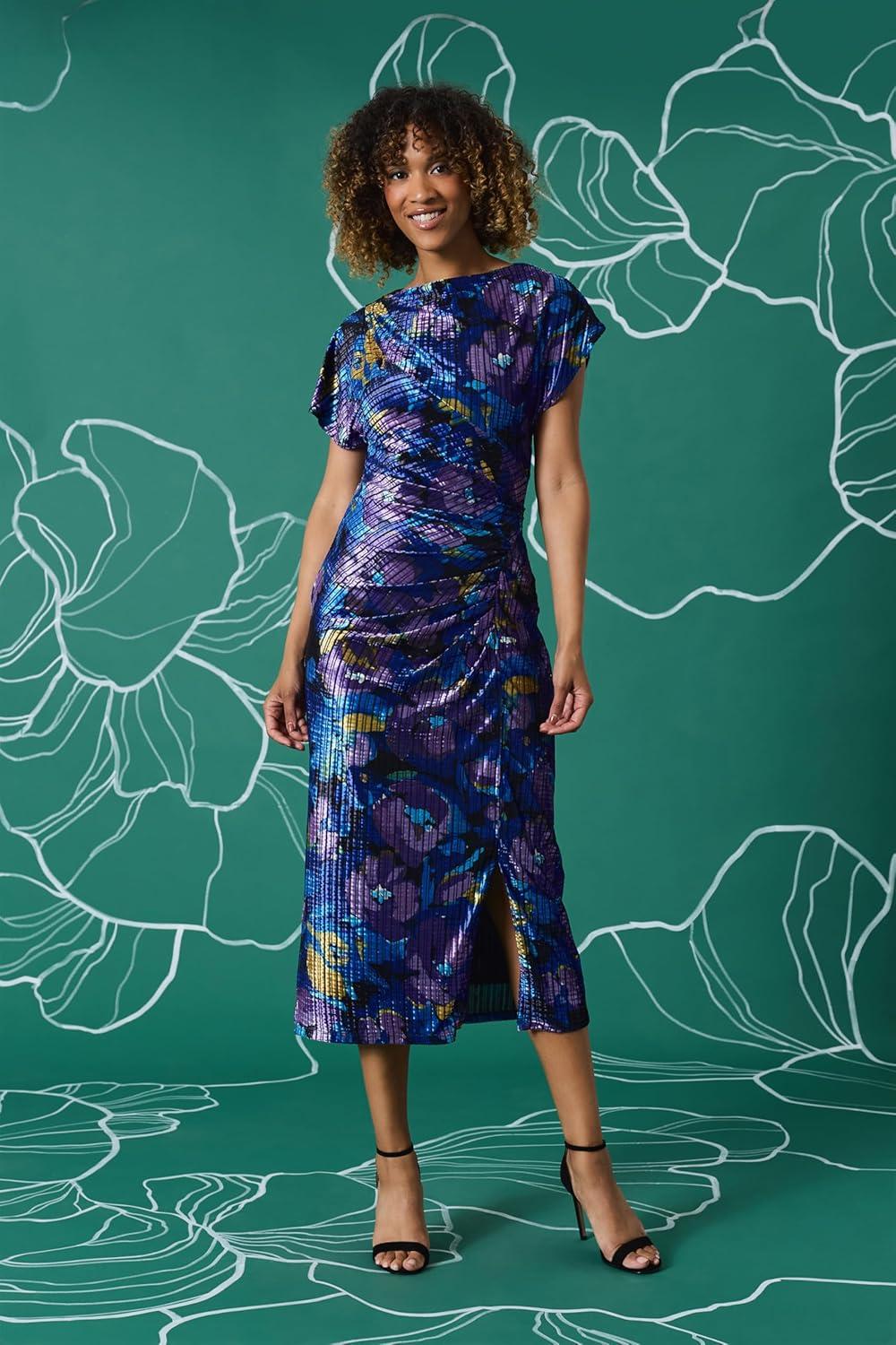 On the move, the dress tends to settle rather than hold a strict silhouette: the draped front relaxes with a few hours of wear and the hemline can shift a little when walking briskly or climbing stairs. Short sleeves occasionally ride up with repeated arm movement, prompting the wearer to smooth the sleeve or shift a seam slightly; similarly, sitting for extended periods frequently enough leads to a quick readjustment of the skirt and a touch-up of the drape so the falls and folds lie as intended. The side closure generally stays concealed but can require a careful pull-up during quick changes to align the seams.