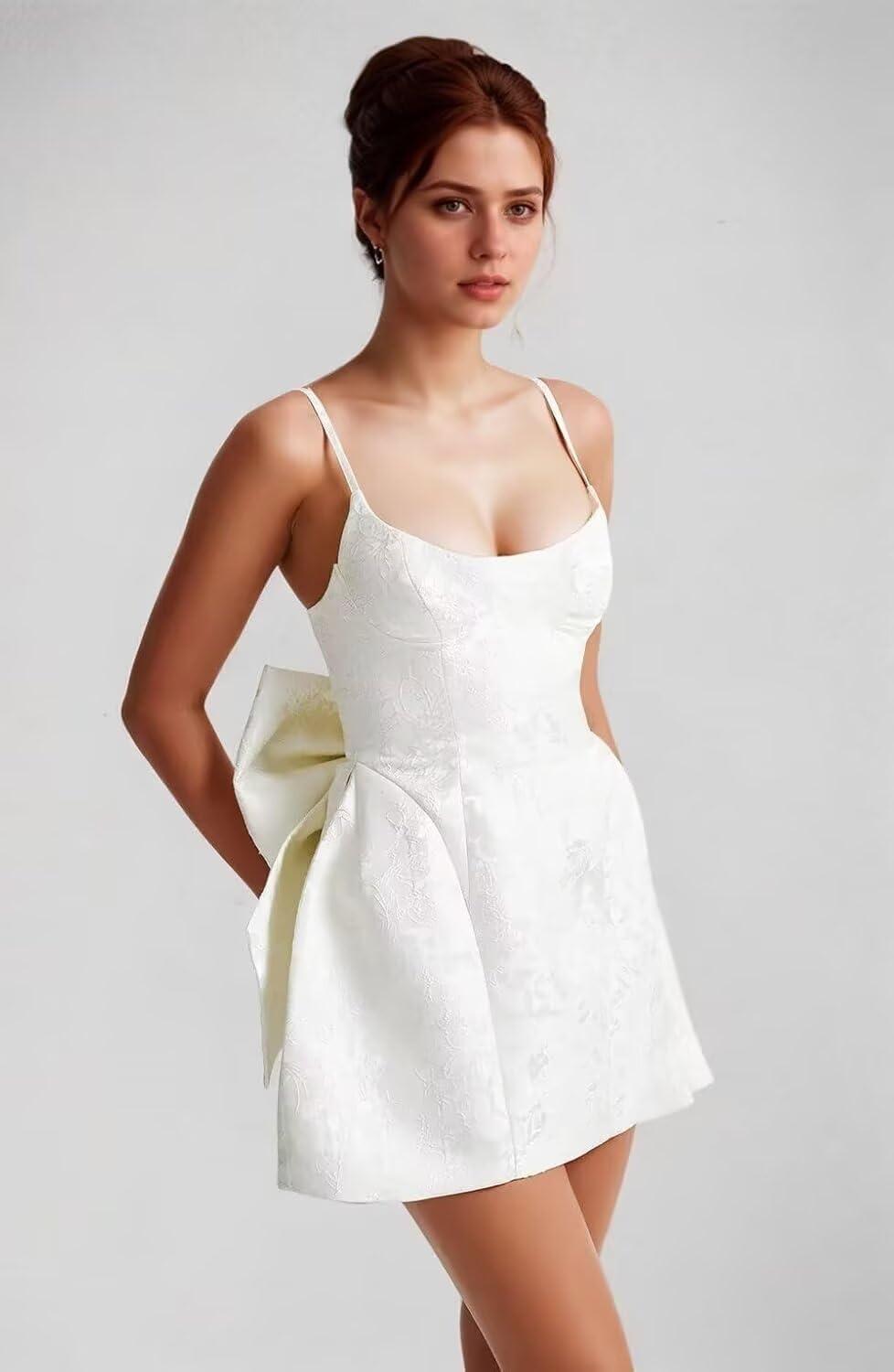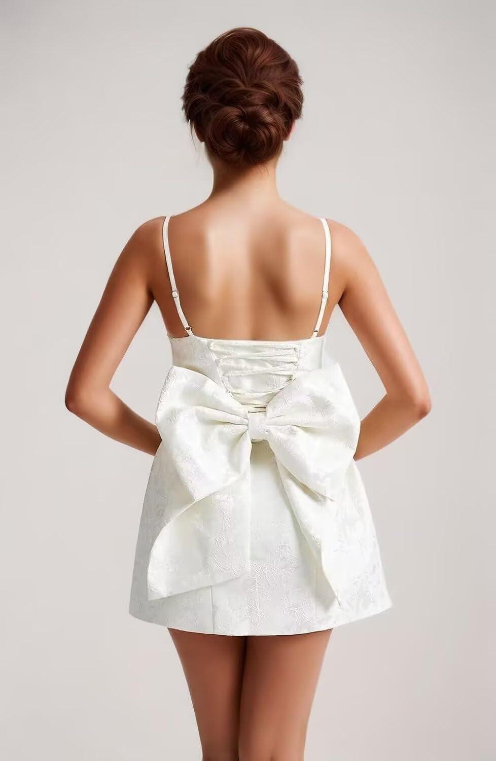 When it comes to styling this sleek satin dress with delicate appliqués and bows, simplicity is key to letting its details shine.Pair it with minimalist accessories like a small silver pendant or subtle stud earrings to keep the look youthful and fresh.for shoes, strappy heels or cute ballet flats in nude or metallic tones complement the short, bodycon silhouette perfectly, elongating the legs while maintaining comfort for an all-night event. As the dress features spaghetti straps and a V-neckline, layering a light, cropped cardigan or a sheer shawl can add warmth without overwhelming its elegant design.