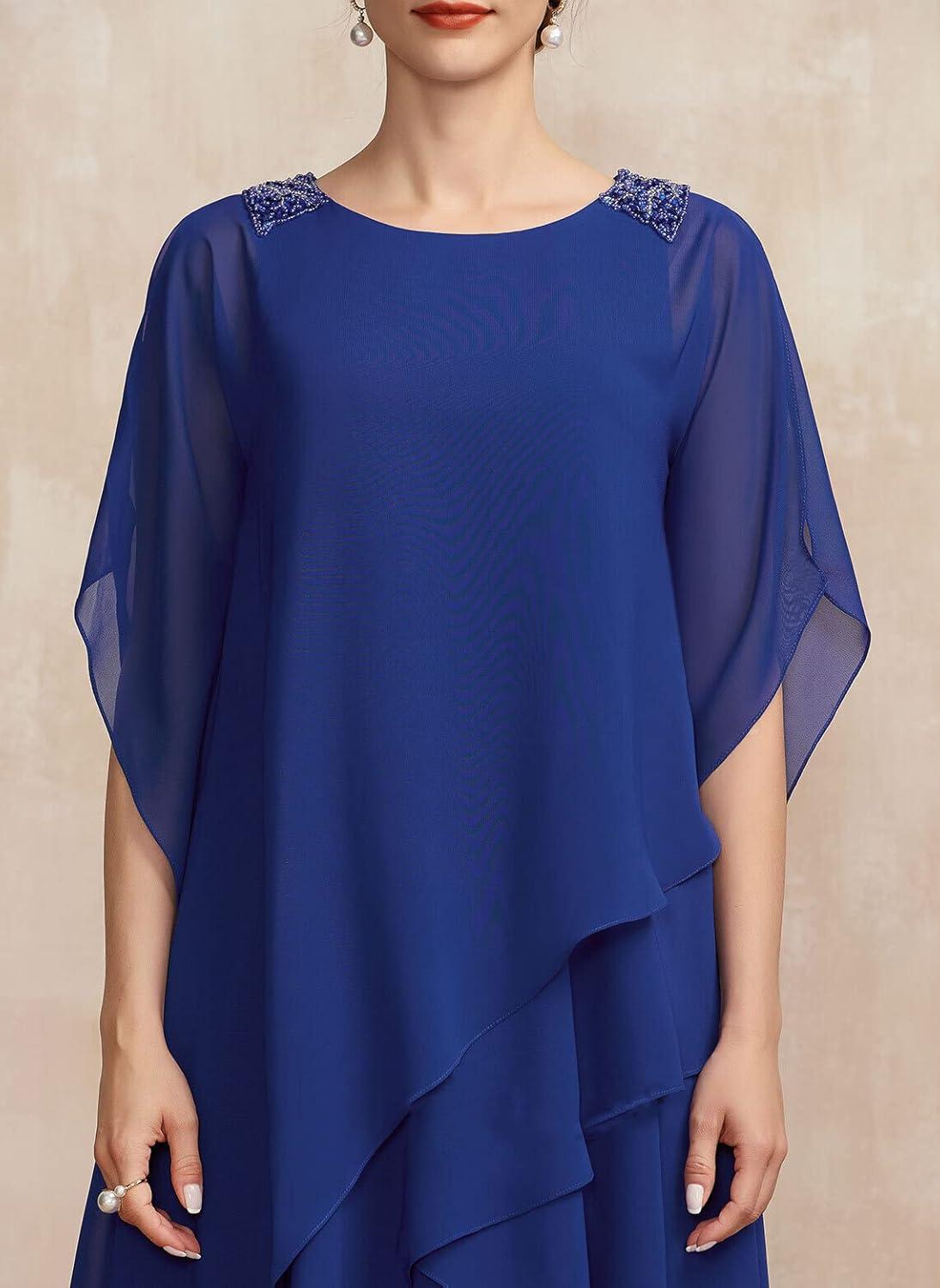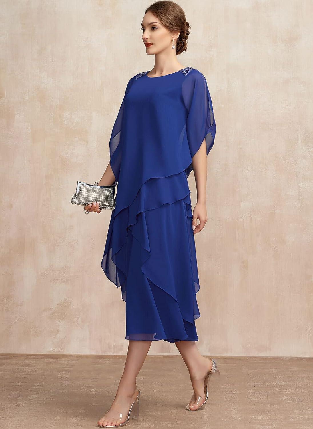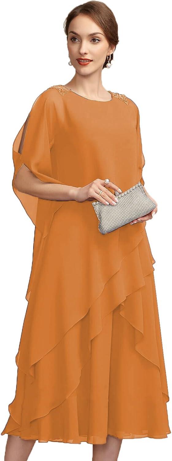 Sliding into NABN’s chiffon ruffle-cape mother-of-the-bride dress, you first notice the cool, whisper-thin fabric brushing your arms and the way the ruffles drift away from your shoulders as you move. Standing still, the dress skims rather than clings: seams sit quietly, the bodice holds a subtle shape, and the cape gives a low, contained visual weight that registers in a slow turn. When you sit, the chiffon folds into soft, paperlike layers across your lap; when you rise, the ruffles unspool and settle back into a loose cascade. Those first minutes of wearing leave you with an impression of airy material married to modest structure—easy in motion, present when you pause.