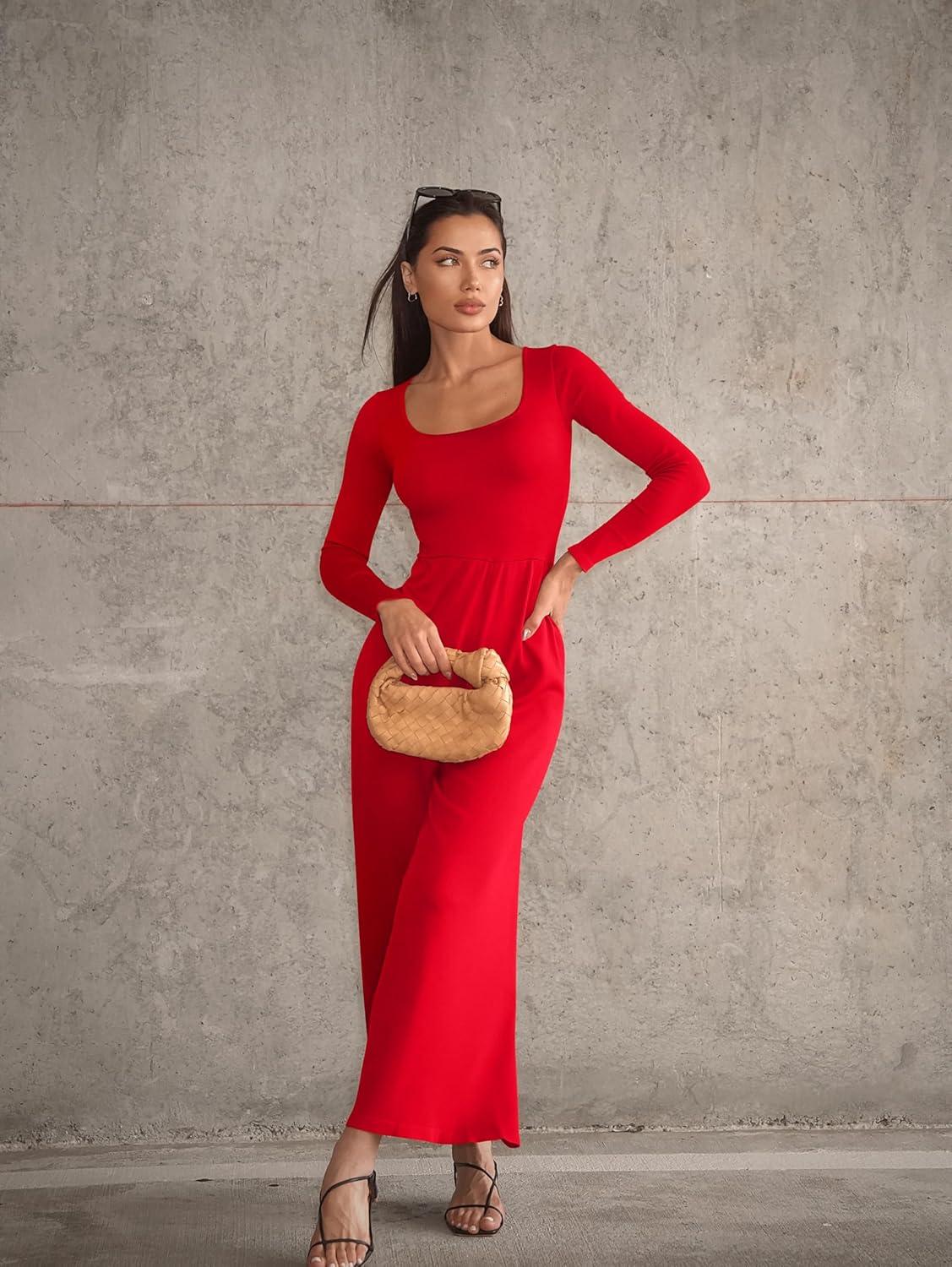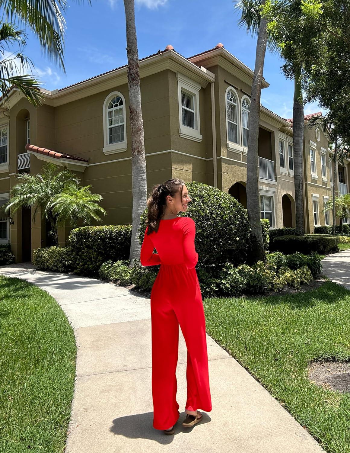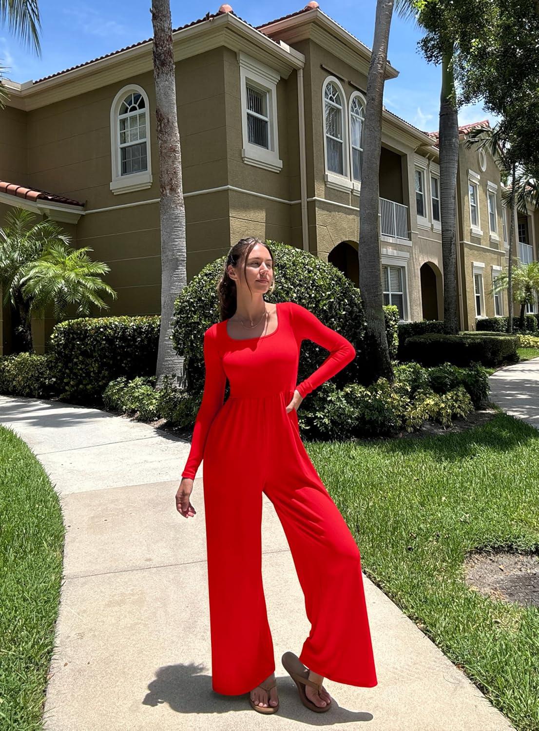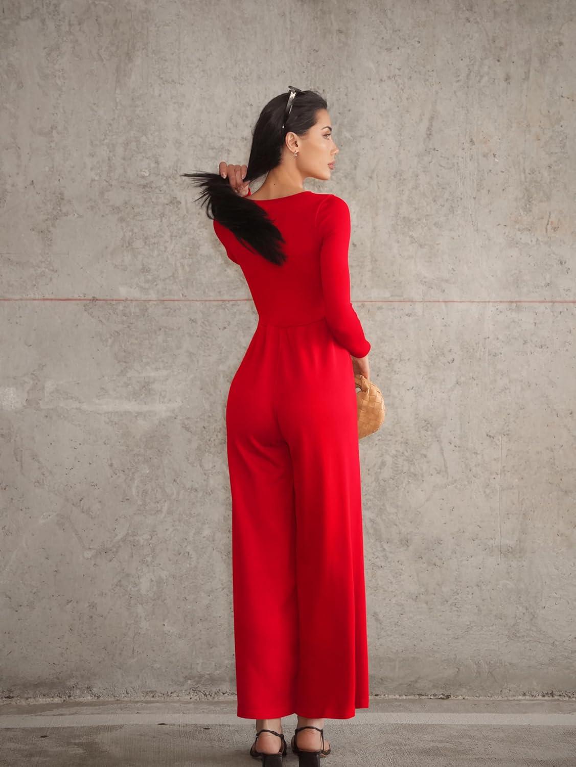 Slipping into the OQQ Women Wide Leg Pants Jumpsuit—the red long-sleeve, square-neck one—you notice a medium-weight fabric that settles against your skin instead of clinging. The material drapes in a steady, straight line from hip to hem, so the wide legs sway and skim your ankles when you walk. As you lift your arms the sleeves give with a quiet stretch and the shoulder seams stay put, while sitting brings soft folds across the thighs rather than awkward bunching. Up close the neckline sits neatly at the collarbone and the overall visual weight feels anchored, like a garment that moves with you but keeps its shape.
