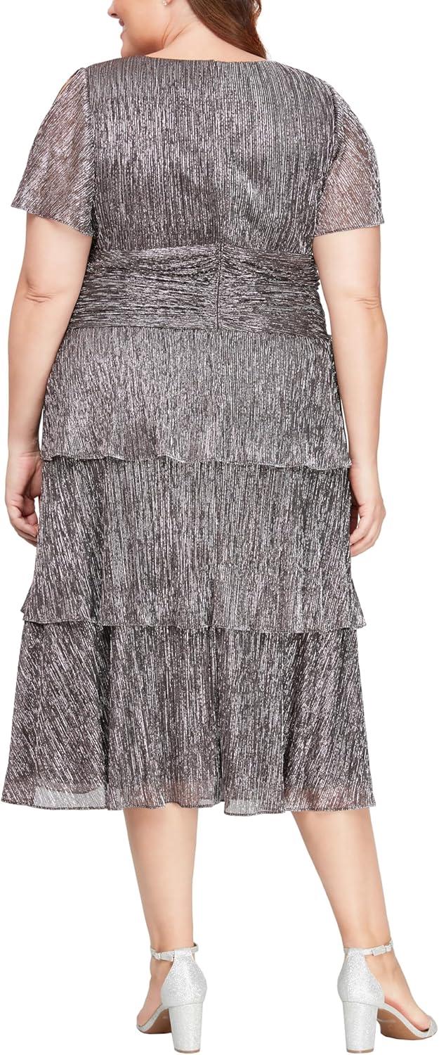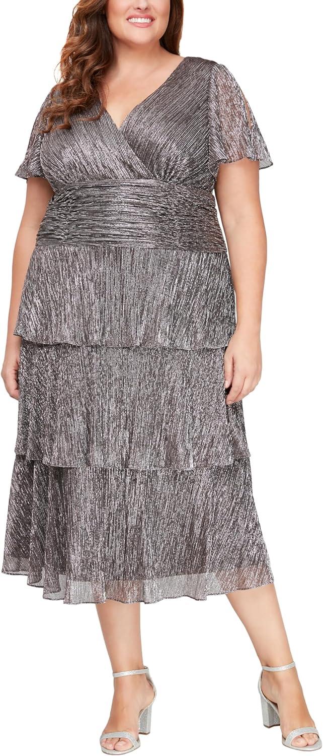 You notice, the moment you step into the S.L. Fashions WomenS Short Sleeve Tea Length V-Neck Mother of The Bride Dress with Ruched waist (Plus Size),that the pleated shimmer fabric is softer than it looks. It has a light, almost whispery weight that still hangs with purpose—tiers that fall into gentle waves as you stand, and fold into soft, quiet ripples when you sit. The ruching at the waist tucks in neatly without creating bulk,and the seams across the shoulders lie flat against your skin as you move: nothing pulls,nothing sighs. Under warm light the subtle sheen reads elegant rather than glossy, and the back zipper glides up without fuss—a small, reassuring detail on first wear.