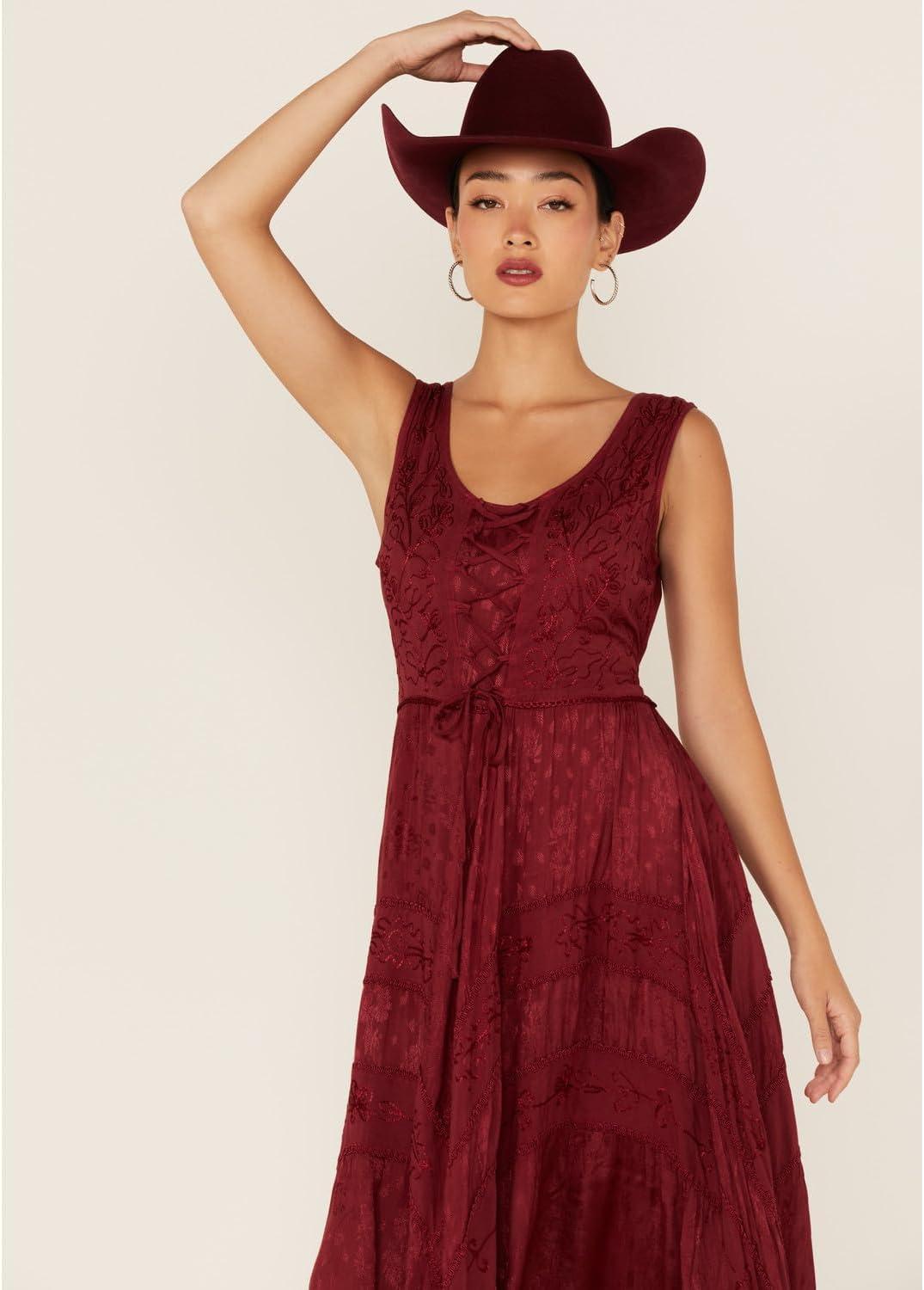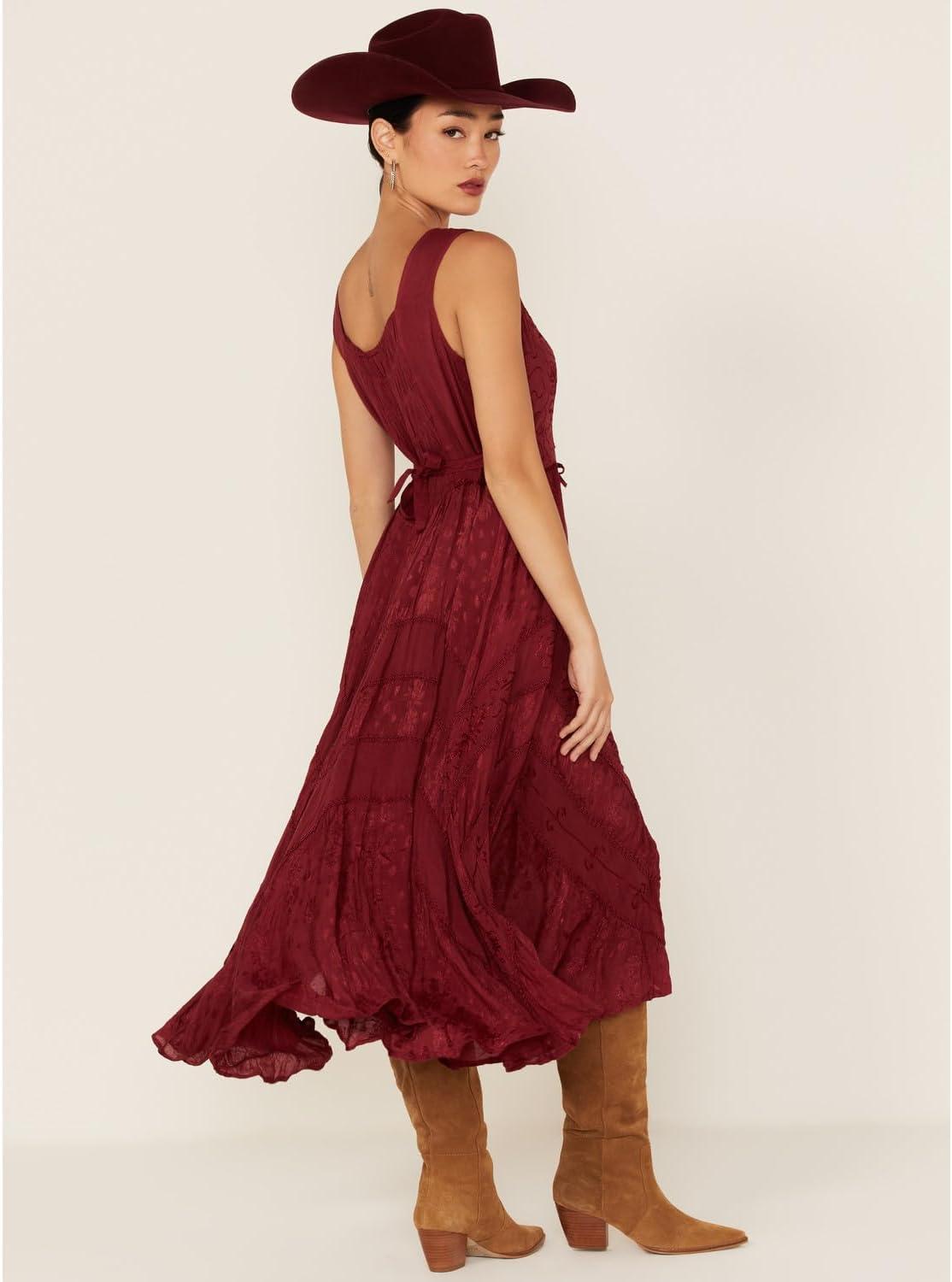 This full-length sleeveless dress promptly caught our attention with its unique lace-up front detail, which adds a dash of vintage elegance to the overall modern silhouette. The scrolling fabric design flows gently across the tiers of the skirt panels, creating a textured yet delicate appearance that’s both eye-catching and versatile. Crafted from 100% rayon, the fabric feels lightweight and breathable, perfect for warm weather or layered during cooler seasons. The dress’s construction offers a flattering fit, while the hand-wash recommendation highlights the need for gentle care to maintain its quality.