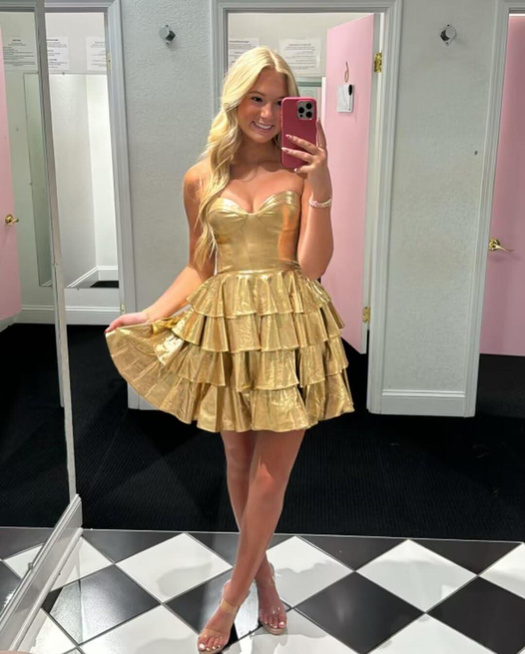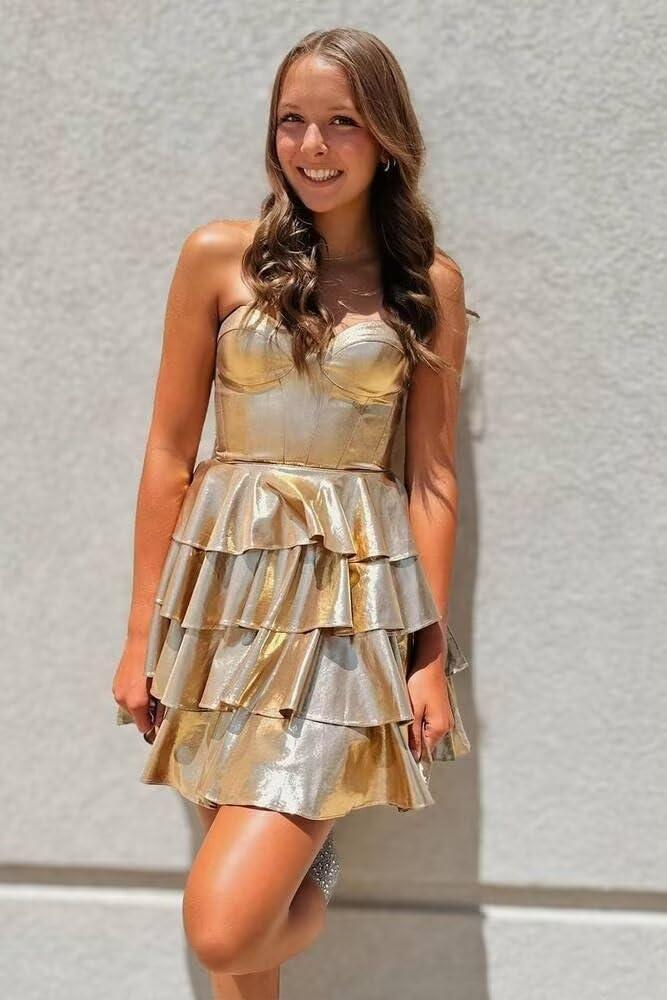We found this dress to be a stunning choice for anyone seeking a chic and modern look for special occasions. Its strapless, sweetheart neckline paired with the tiered short skirt creates a playful yet elegant silhouette, perfect for homecoming, prom, or cocktail parties.The metallic satin fabric adds just the right amount of shimmer and sophistication without overwhelming the overall design.It’s especially well-suited for teens who want to stand out with a fresh,youthful vibe while maintaining a classy edge. The mini length allows ease of movement, making it comfortable for dancing the night away.