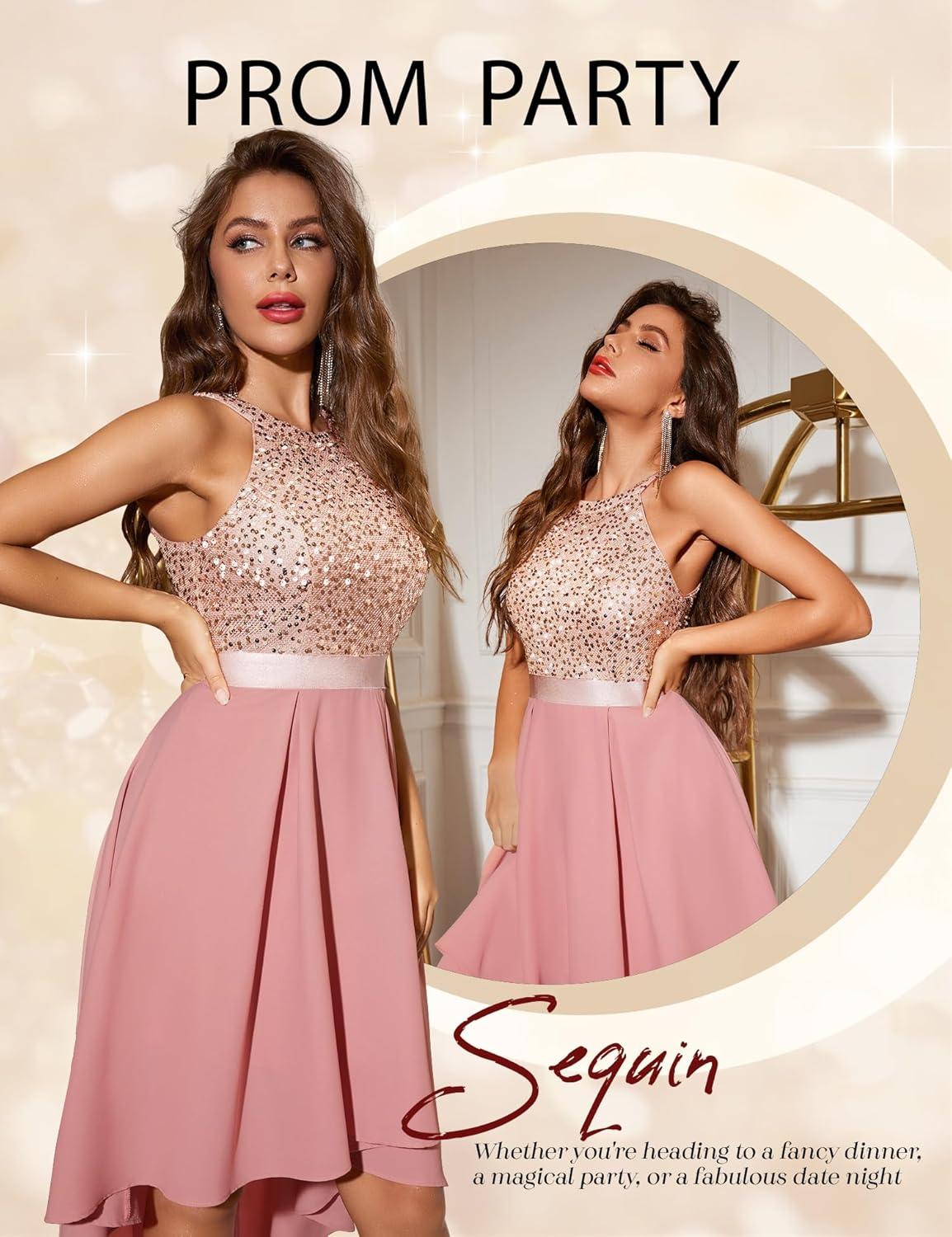From the moment we tried on this dress, its shimmering sequin fabric immediately caught our attention, perfectly balancing sparkle with elegance. The halter neckline offers a flattering silhouette, and the unique hi-lo hemline adds a modern and playful touch that made movement throughout the evening effortless and graceful. We found it extremely versatile-paired easily with thin high heels and subtle accessories, making it an ideal choice for various events like cocktail parties, homecomings, weddings, and formal gatherings.