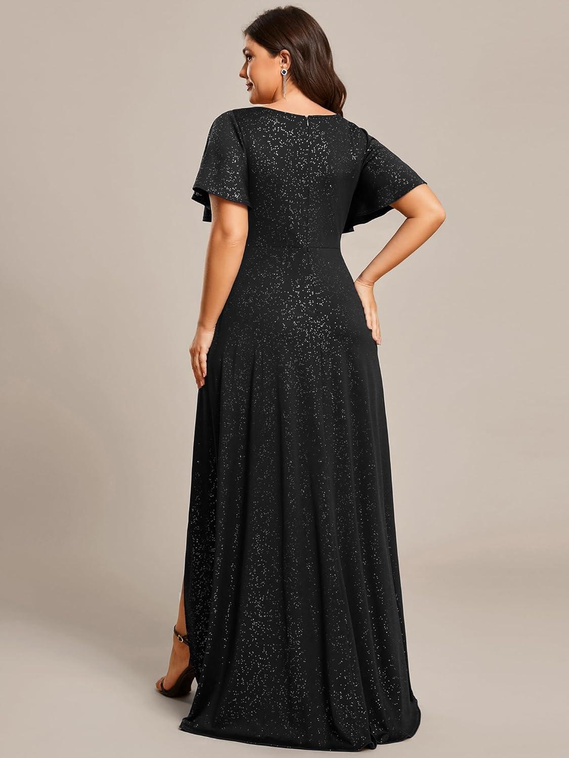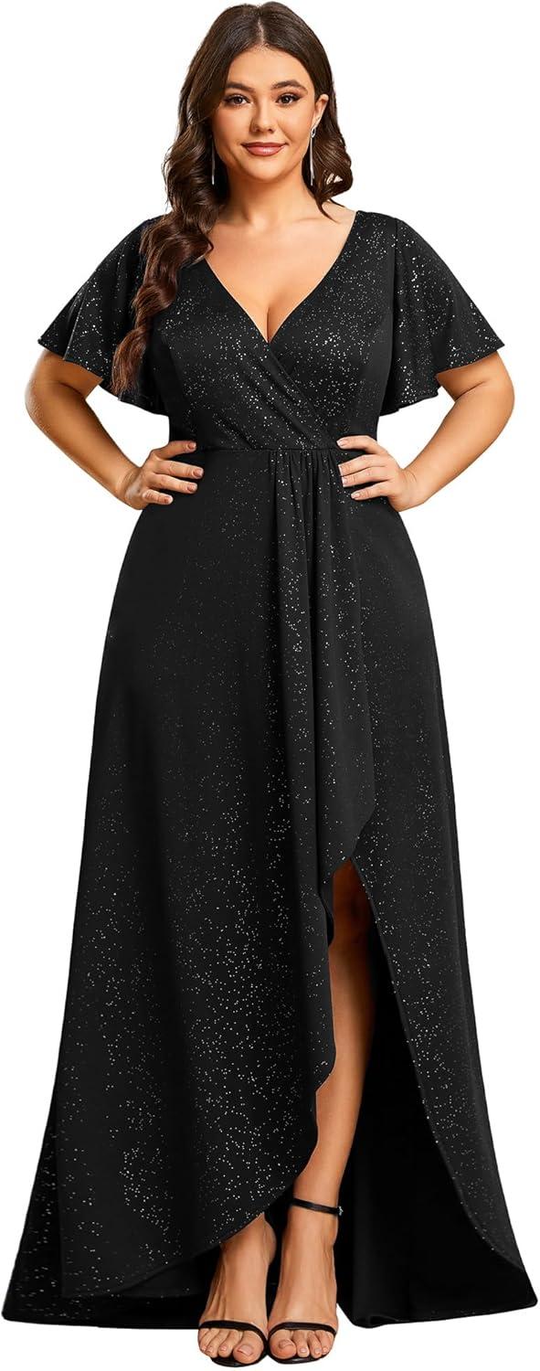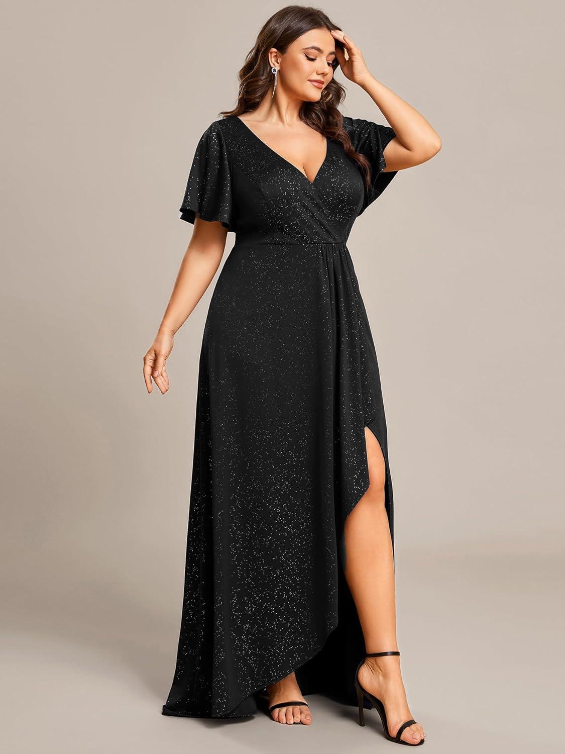 This dress strikes a stunning balance between elegance and comfort.Crafted from luxurious glitter fabric, it adds just the right touch of sparkle without overwhelming the look. The high-stretch material ensures a flattering fit that moves with you, making it an ideal choice for dancing the night away or confidently mingling at sophisticated events. Its unique high-low hem and ruffle sleeves create a modern, stylish silhouette that flatters plus-size figures gracefully. Whether it’s a prom, formal party, or a festive holiday gathering, this gown stands out as a versatile option that you’ll want to wear more than once.