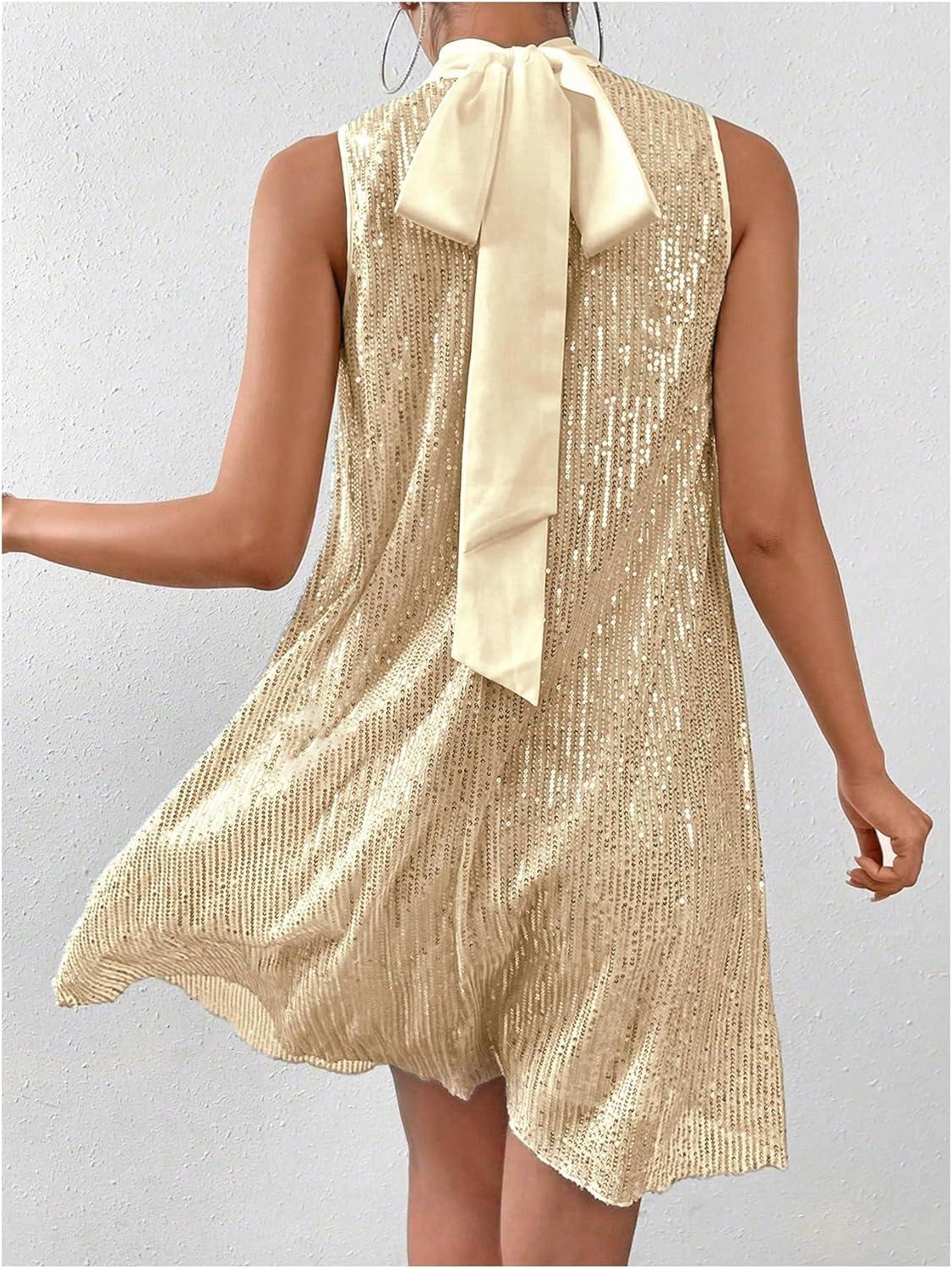 When it comes to versatility, this sleeveless tank dress truly shines. Its high neck design combined with the eye-catching contrast sequins allow it to easily transition from a sophisticated evening look to a more playful party outfit.Whether paired with heels for a formal event or styled with a chic jacket for a night out with friends, it adapts seamlessly to various dress codes. The bow detail adds a touch of elegance without overwhelming the overall flashy appeal, making it suitable for cocktail parties, holiday gatherings, and even upscale dinners.