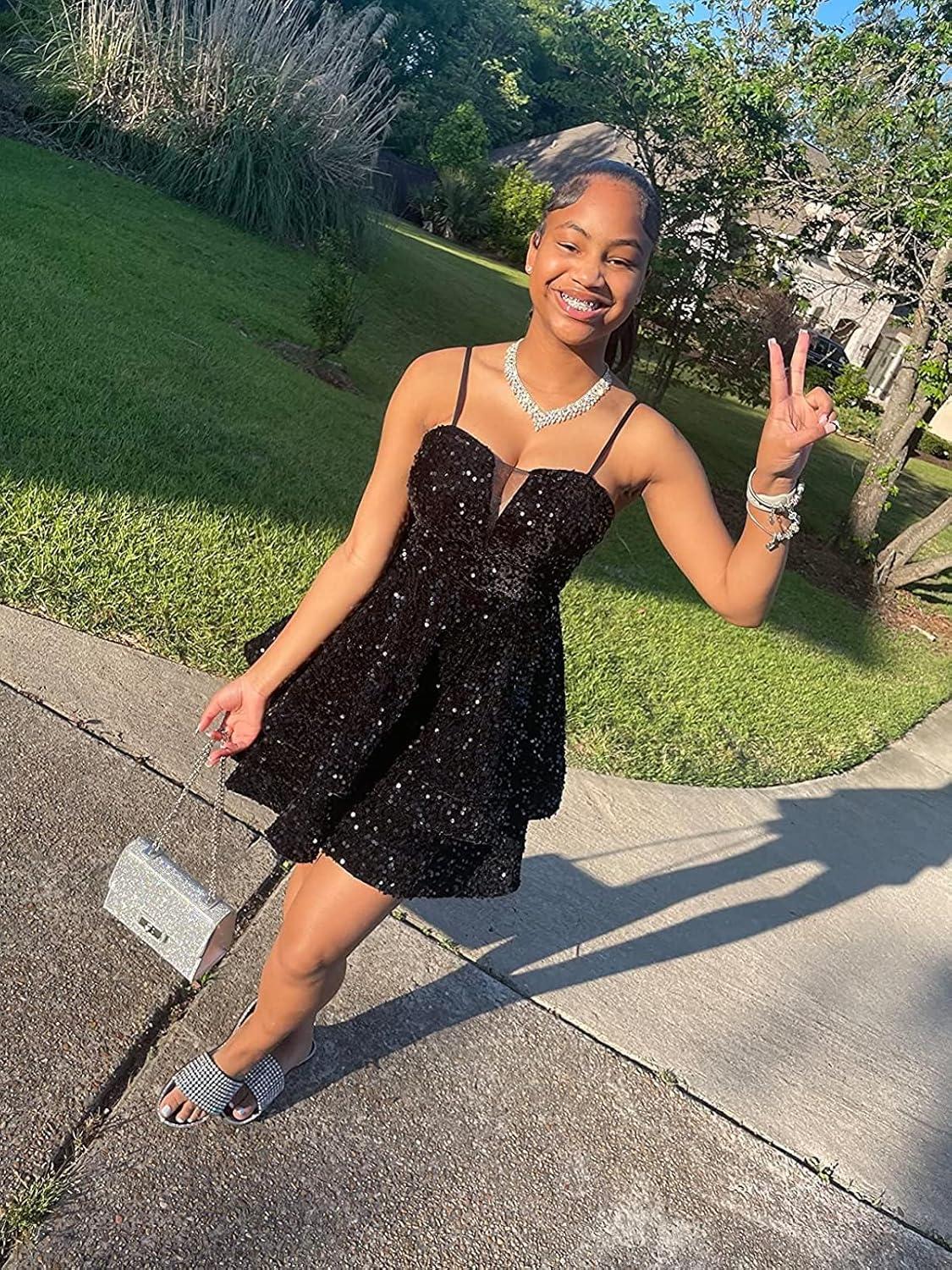 this tiered sequin dress strikes a stunning balance between youthful charm and elegant sparkle, making it an excellent choice for teens attending prom, homecoming, or any formal party where they want to stand out. The spaghetti straps and above-knee length combine to create a flattering silhouette that’s both fun and sophisticated, perfect for those who prefer a playful yet classy look. The tiered design adds volume without overwhelming, enhanced by shimmering sequins that catch the light beautifully, ensuring all eyes will be on you.