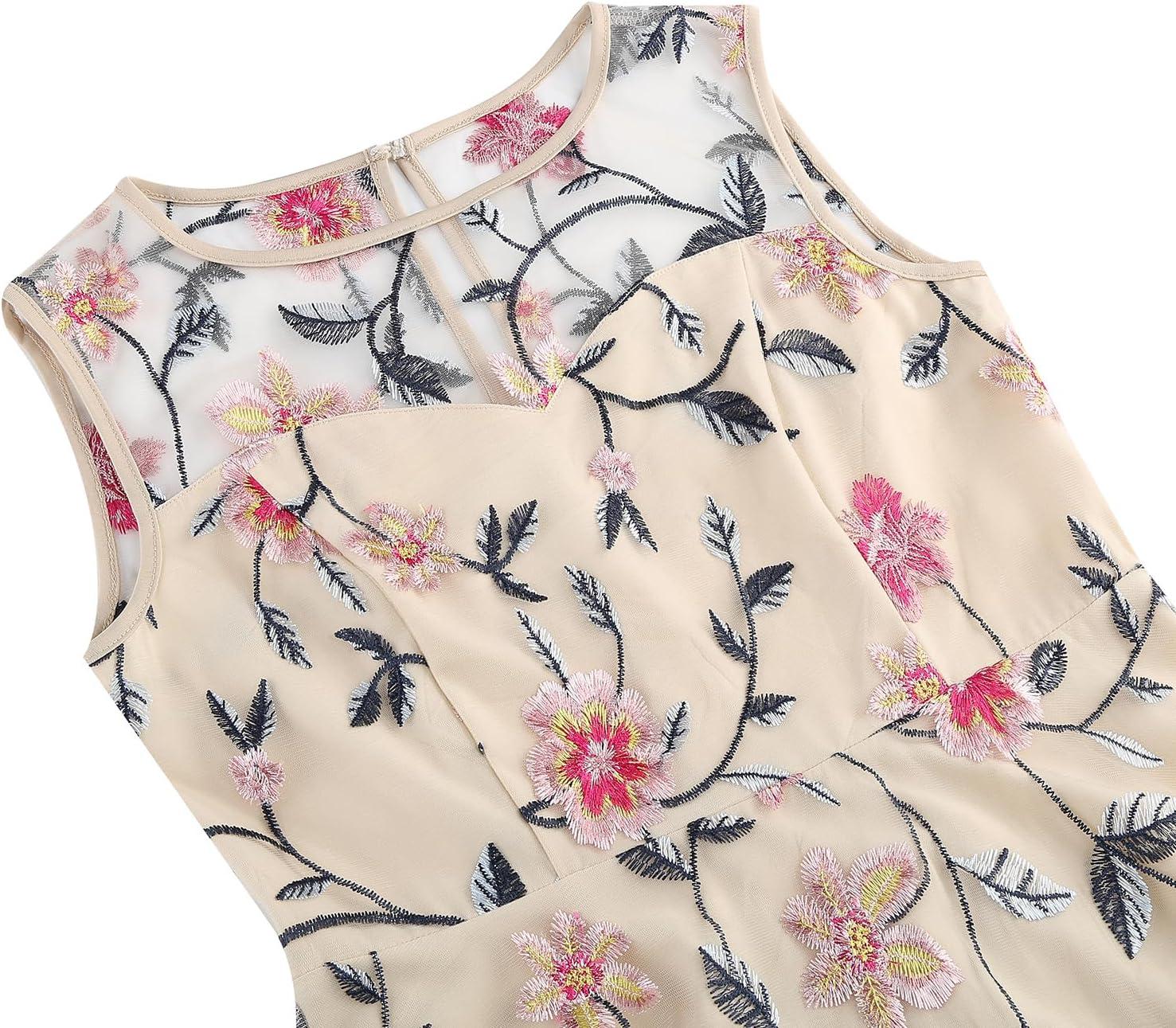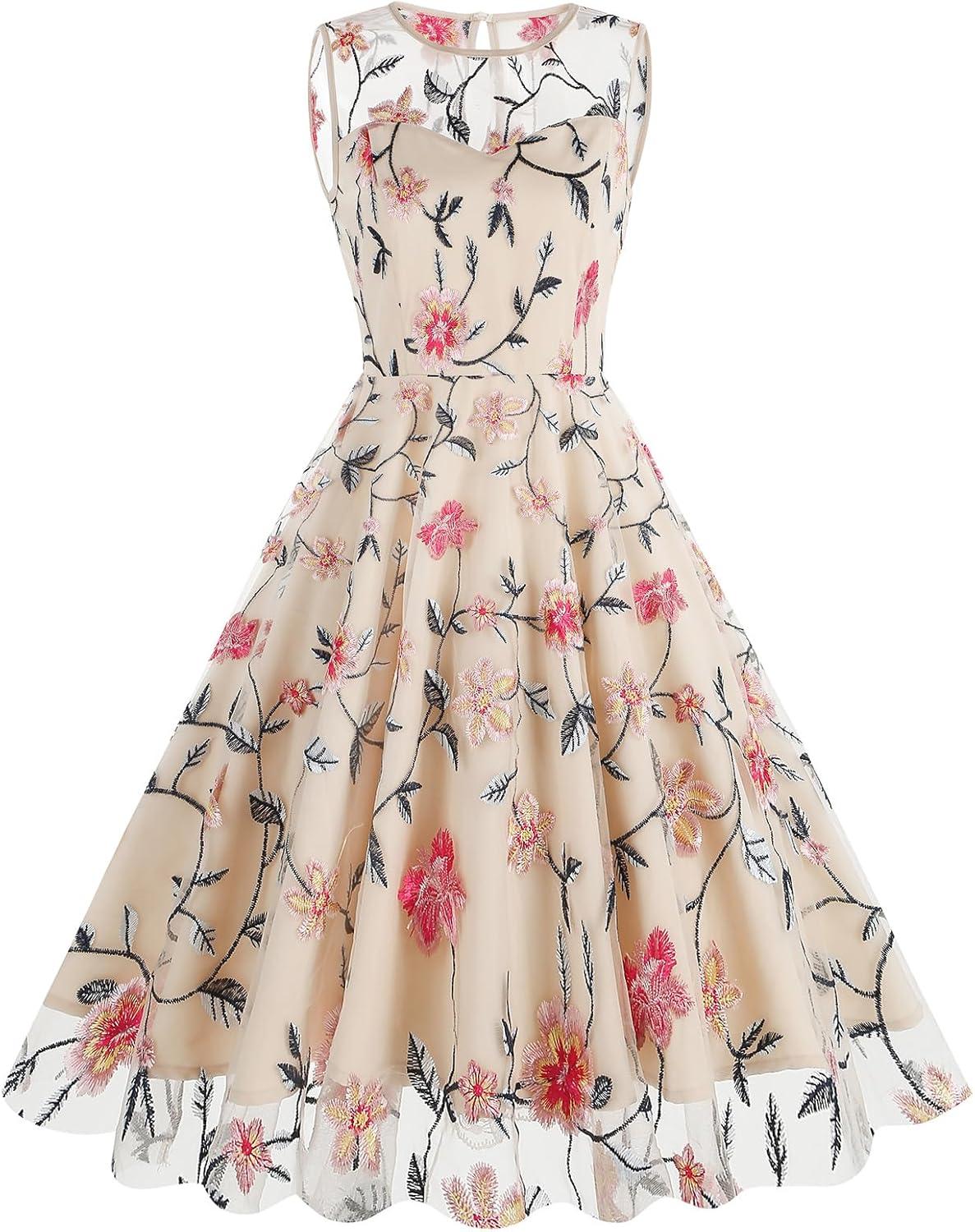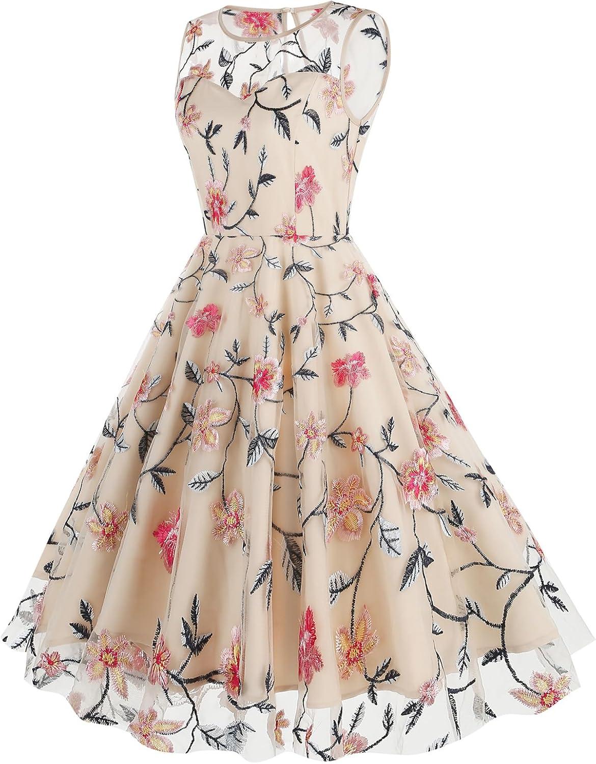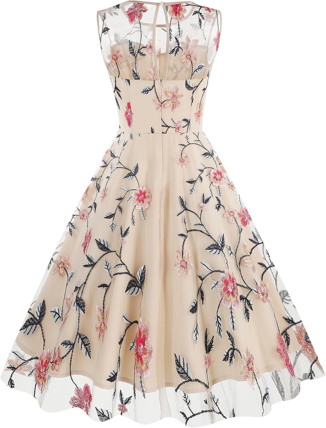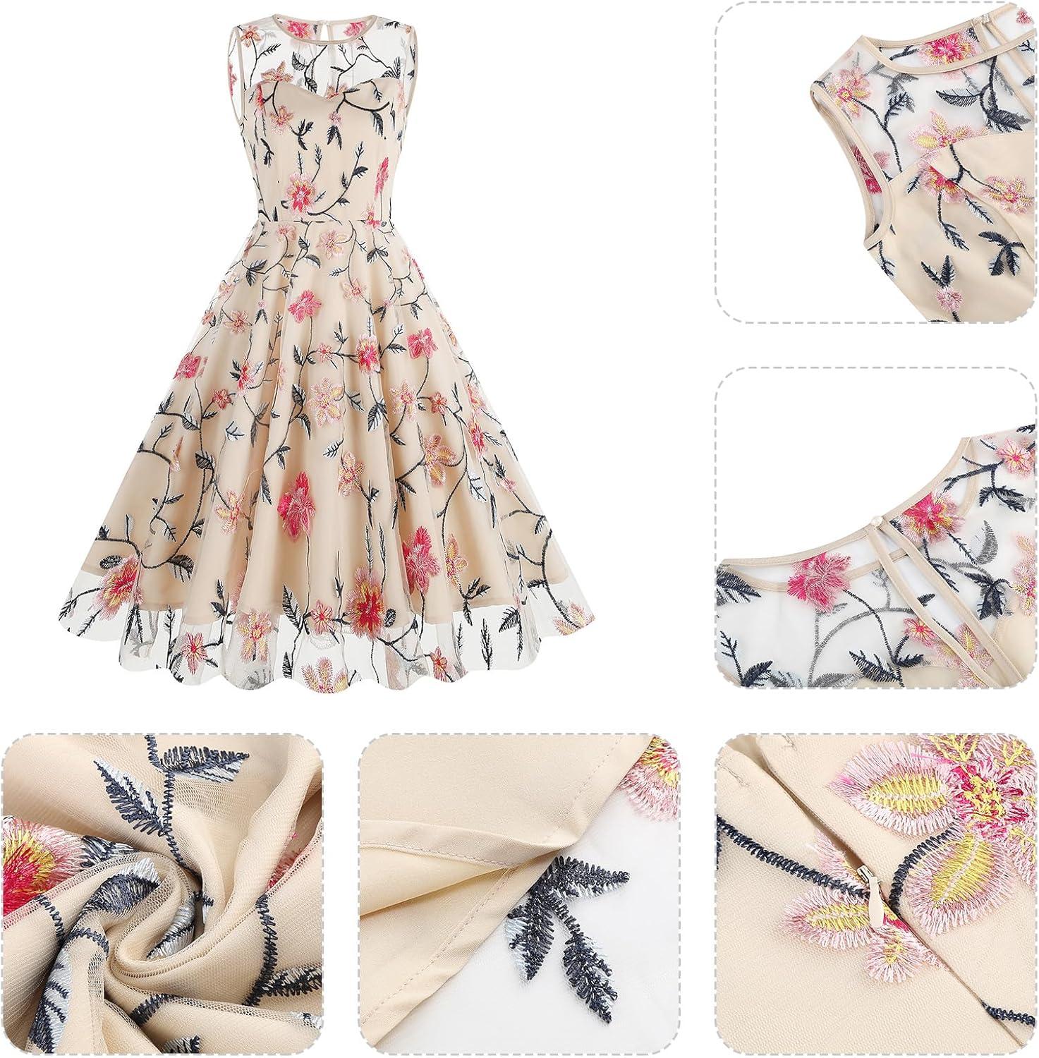This dress truly shines in its ability to adapt across a variety of events. Its classic floral embroidery paired with the vintage 1950s swing silhouette offers a timeless elegance that fits effortlessly from formal to semi-casual settings. Whether attending a cocktail party, an evening gala, or a wedding ceremony, it strikes the perfect balance between sophistication and playful charm. The sleeveless mesh design adds a subtle modern twist, making it equally suitable for warmer weather occasions or layering under a chic jacket for cooler evenings.