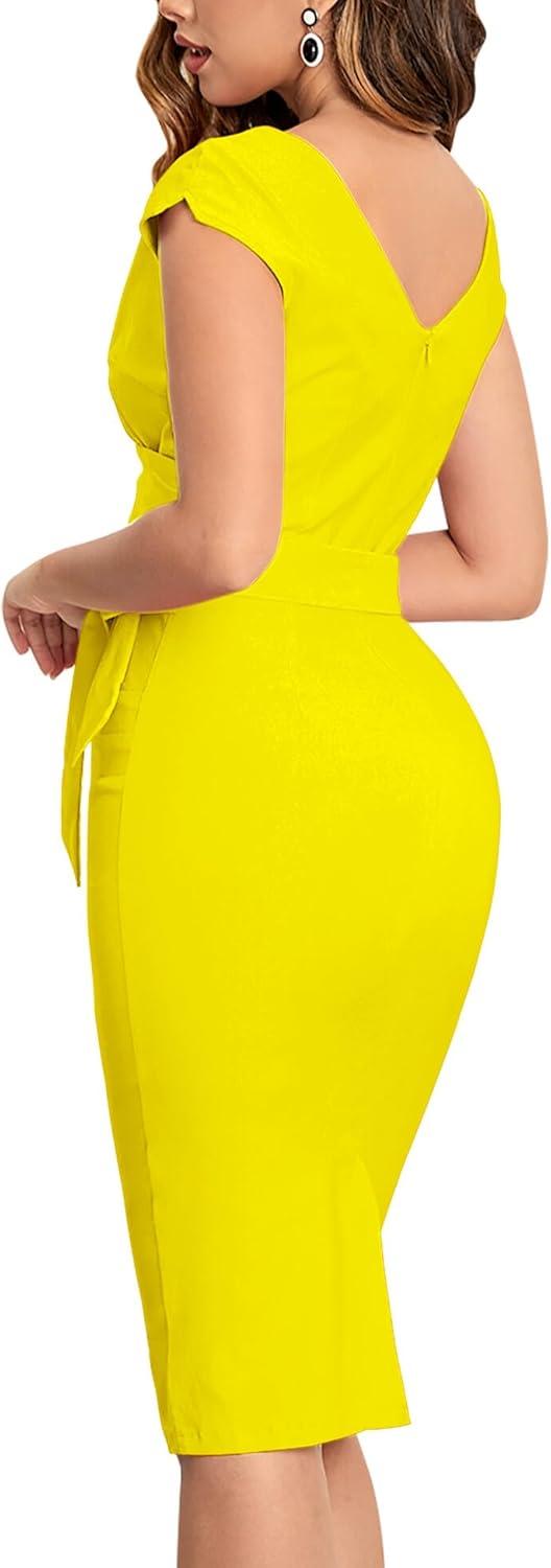 After wearing and assessing this vintage-inspired cocktail dress, we appreciate how it effortlessly blends classic elegance with modern comfort. The fitted bodycon pencil silhouette beautifully accentuates curves while the wrap V-neck and tie waist detail add a feminine charm that flatters a variety of body types. Its midi length and timeless style make it perfect for formal events, weddings, or any occasion where you want to make a polished statement without sacrificing ease of movement.