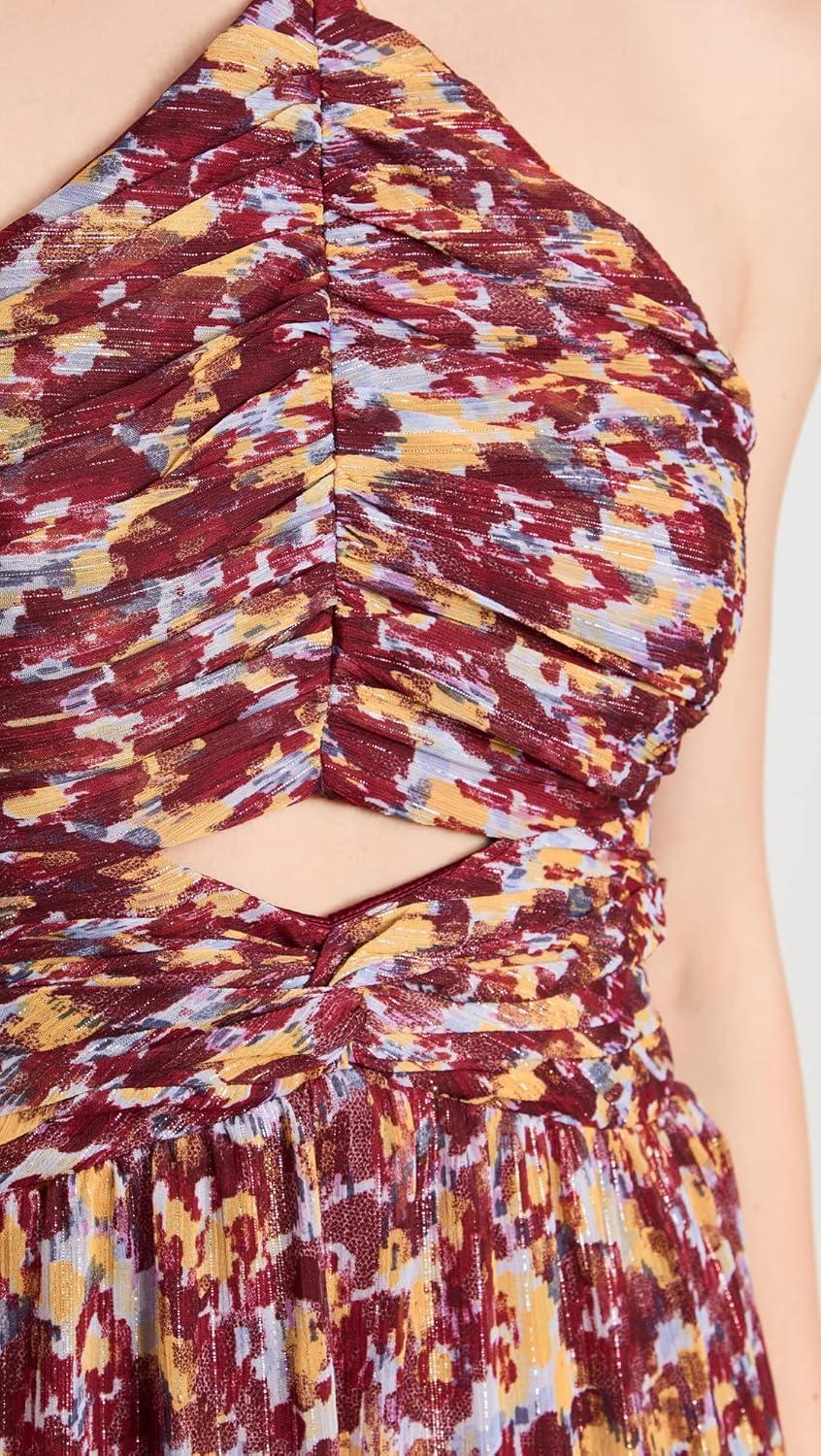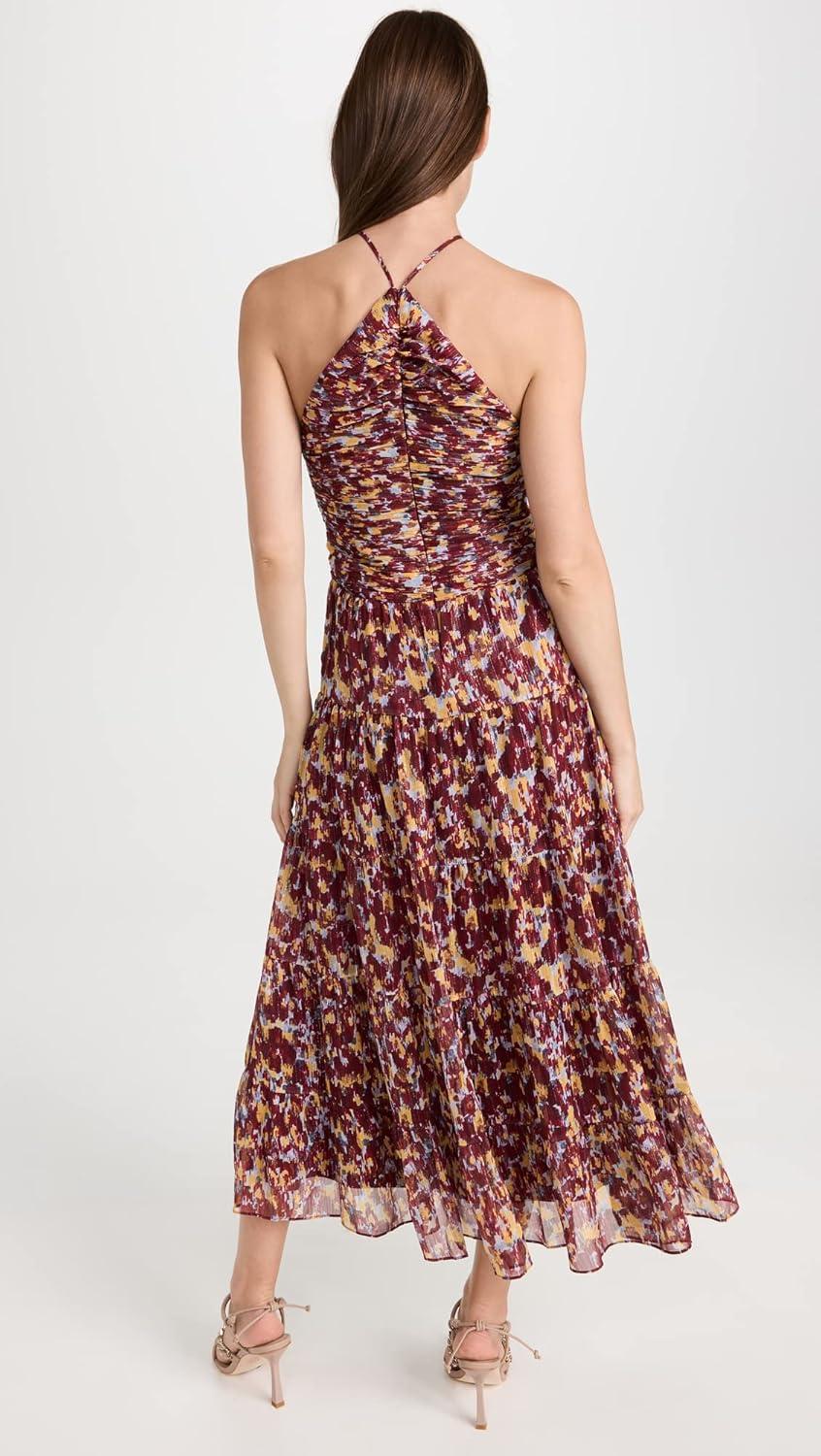 From a design standpoint, several key details elevate the dress beyond its color story. The flowy halter neckline offers graceful movement and a flattering silhouette, while the thoughtfully placed ruching in the front enhances texture and dimension without overwhelming the design. The subtle cut-out beneath the bust adds an unexpected yet tasteful flair, breaking up the dress’s lines in an appealing way. Together, these features create a cohesive garment that flatters various body types and invites compliments.