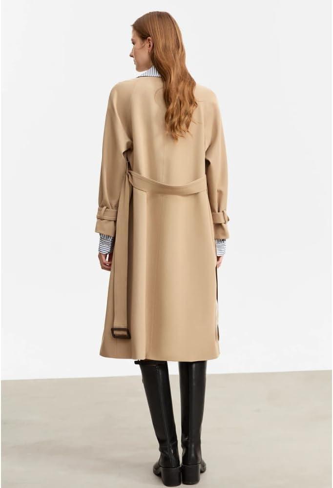 By the time evening arrives you feel the coat has quietly accumulated a day’s worth of small stories. Your phone sits lower than it started, the pocket mouth a little more open where you habitually slide it in one-handed. Loose change and receipts gather into a soft lump that favors one side; every so often you catch yourself shifting the load with a thumb before reaching for the door. The fabric around the hip softens into shallow folds where you sit, then sharpens again when you stand, never quite returning to that neat morning plane.creases map your movements: a diagonal line across one sleeve from how you bend your arm, a faint fold at the back where you lean against a chair. Fastenings show their own day-long choreography — the belt drifts a touch during a walk, the knot slightly off-center after you shoulder a bag, snaps and buttons holding steady but puckering a hair when you reach forward. You smooth a lapel absentmindedly, tug at a seam near a pocket, then stop; the small adjustments become part of the rhythm, evidence of use rather than damage.