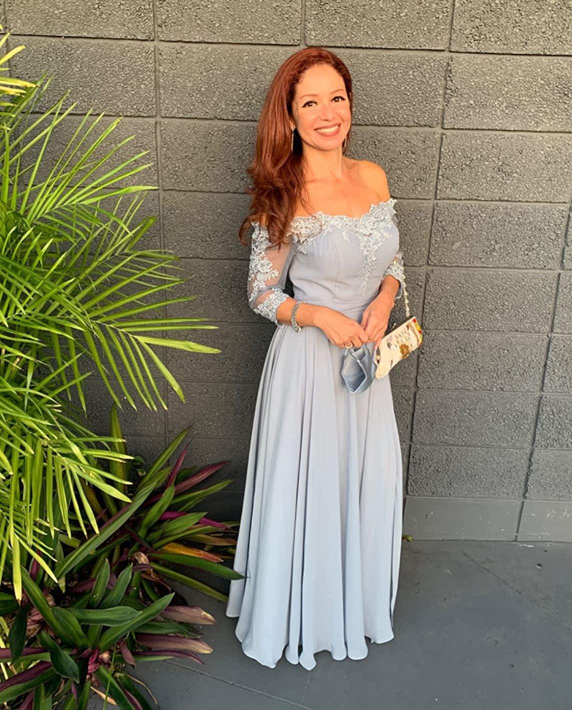 from the moment we slipped into this elegant gown, the fit felt remarkably flattering and cozy. Designed with a graceful A-line silhouette and floor-length chiffon,it drapes softly without feeling restrictive.The off-shoulder neckline paired with delicate short sleeves offers a balanced combination of modesty and sophistication. The lace appliques add a lightweight texture, enhancing the overall comfort, while the slit provides subtle freedom of movement without compromising the refined look. The back lace-up closure was notably helpful, allowing us to adjust the dress perfectly to our body shape.