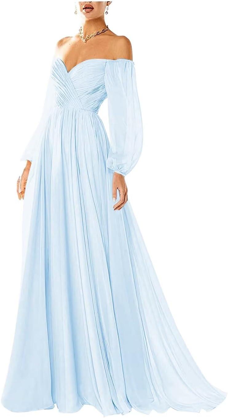 At first glance you notice the off-shoulder neckline and the sweep of the skirt; the silhouette reads as elongated and gently rounded at the waist when you stand. puffy long sleeves catch light differently as your arms move, sometimes billowing then settling close to the forearm.The floor-length hem creates a continuous line from hip to toe,and the corset back quietly pulls the torso into shape so the gown appears composed even when you shift your weight or smooth the fabric at your hips.