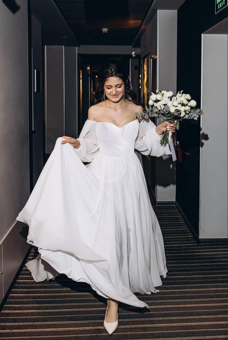 You step into ternlm’s Boho off-shoulder chiffon gown (TN003) and the first thing you notice is the fabric — cool and slightly papery against your skin, layered so it drapes in soft, airy ripples. The A-line skirt unfolds to the floor with a reassuring hem weight that keeps the silhouette grounded as you walk, while light finds the folds and plays along them. The puffed long sleeves brush your arms with a gentle resistance, and the corset back quietly alters how the bodice sits across your collarbones as you move from standing to sitting. In those first moments the dress feels lived-in rather than theatrical: chiffon that breathes around a modest structure, reacting to each step and gesture with small, honest motions.