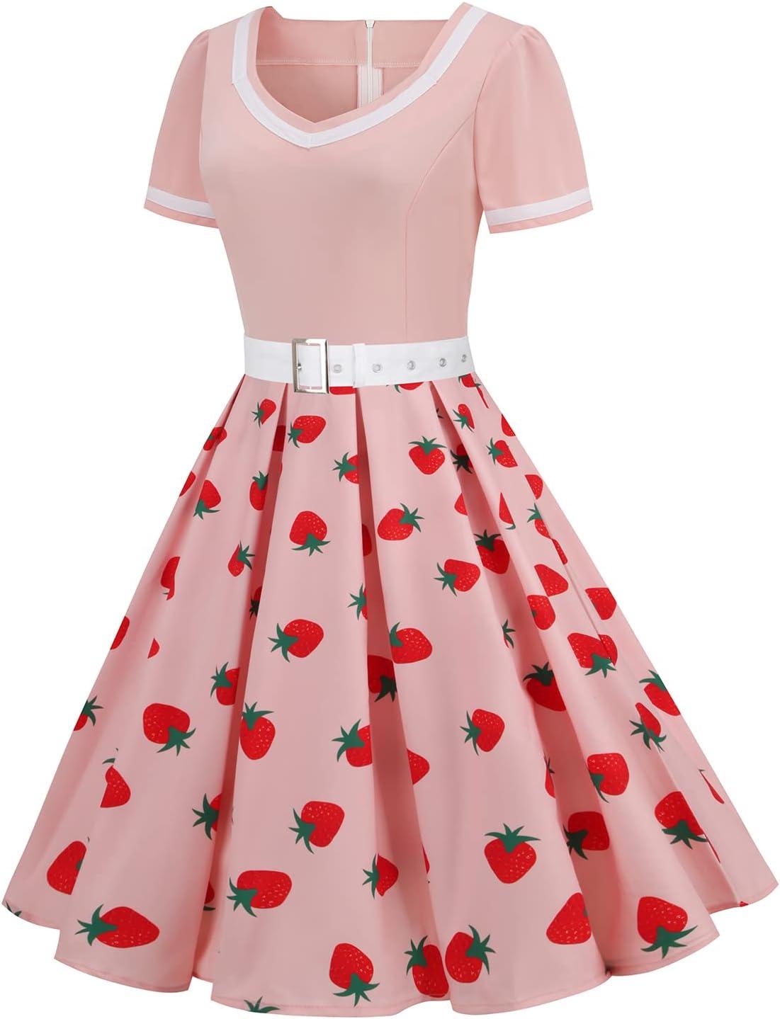 Drawing inspiration from the timeless elegance of audrey Hepburn,⁢ this dress beautifully captures the quintessential 50s and 60s silhouette that⁤ remains iconic to this day. The midi length combined with short sleeves and a cinched waistbelt highlights a graceful⁤ hourglass figure, offering ​a flattering yet comfortable ‌fit. The soft ⁣pink shade infused with subtle vintage strawberry prints adds a⁣ playful yet refined touch, making it perfect ⁤for both cocktail parties⁤ and casual retro gatherings. We appreciate how the ​swing skirt moves effortlessly, creating ‌a flattering drape that recalls‍ the charm and poise of classic Hollywood glamor.