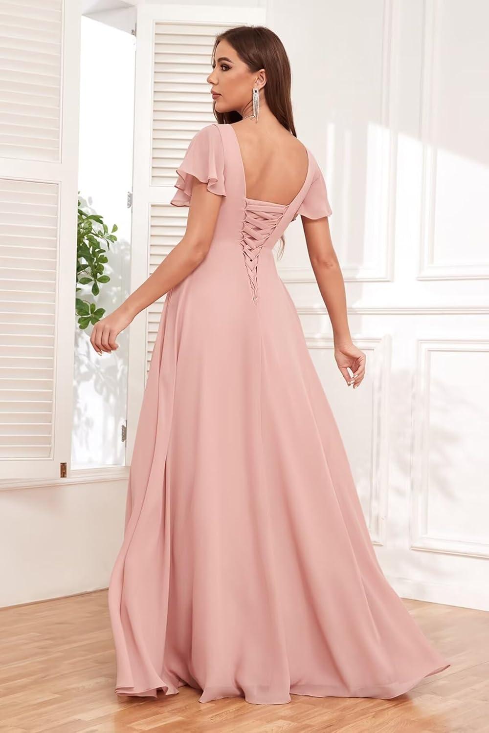 When you move in this long chiffon gown the effect is what you hope for: the outer layer skims your frame and the ruffle sleeves and slit add a soft, kinetic sweep that flatters movement without clinging. The V-neck opens the collarbone and the adjustable back drawstring lets you fine-tune the fit at the waist so the skirt falls smoothly over your hips — on a size 8 this reads as true-to-size for a balanced bust-to-hip proportion, but remember chiffon has no stretch, so the silhouette is shaped by seams and the drawstring rather than elastic give. The lining keeps the dress opaque while letting the outer chiffon float, so you get a polished look for walking down aisles or across reception floors without feeling restricted or overheated.