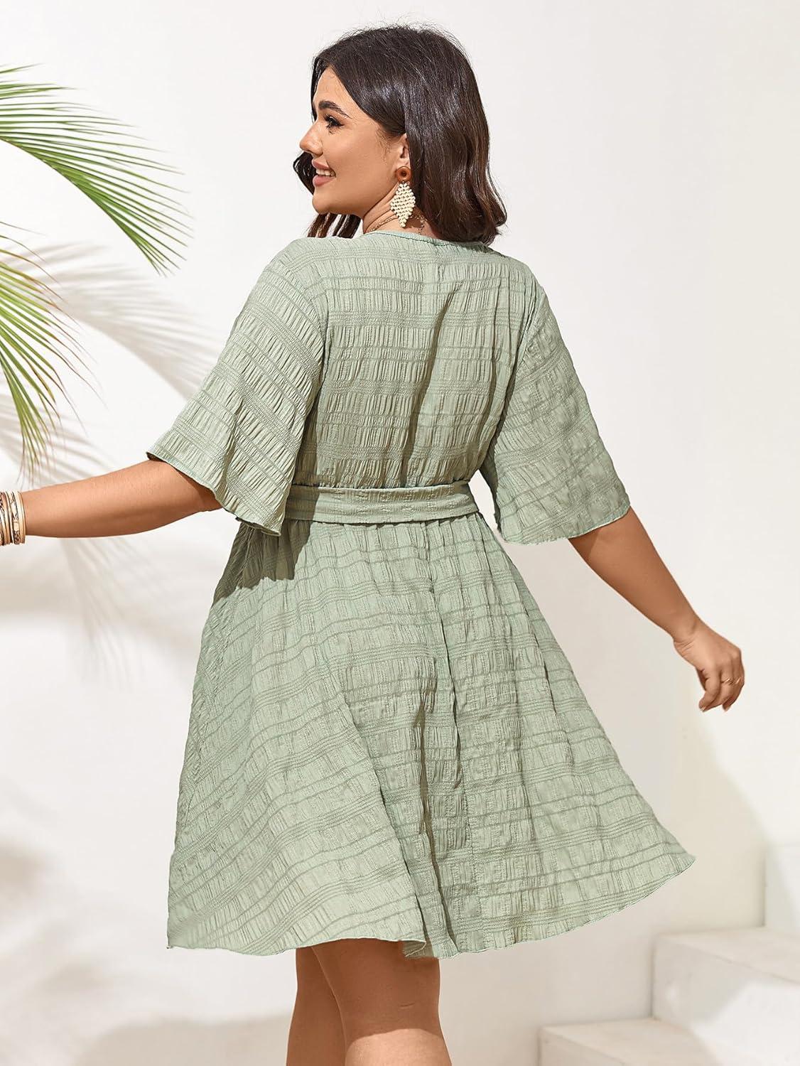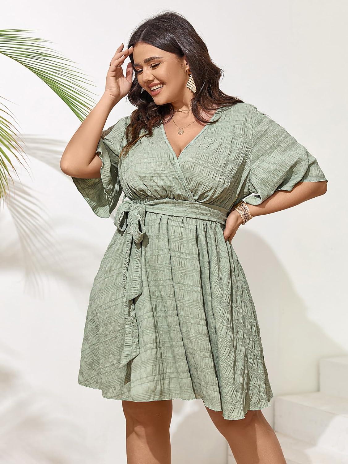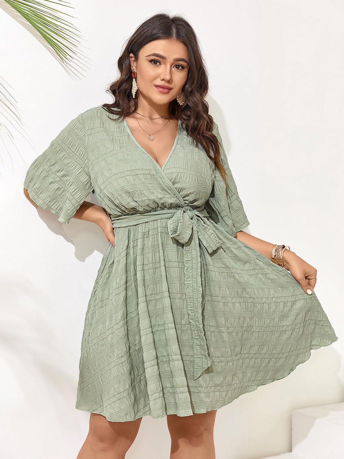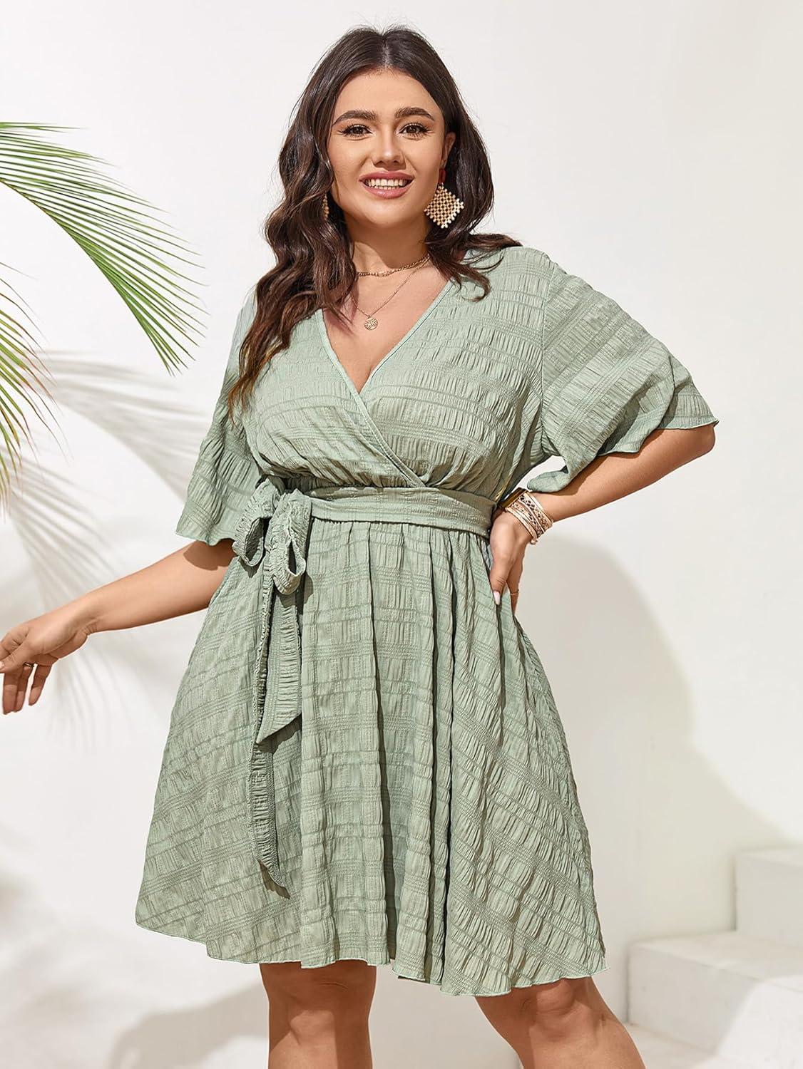 we ordered the SCOMCHIC Plus Size Dress in green (2XL) with the simple goal of finding a pleasant, flattering option for summer weddings and cocktail events. At first glance the dress felt promising: a short-sleeve, wrap-style silhouette with a deep V-neck, a belted waist, ruffle sleeves and a subtly textured fabric that gives the piece a bit more visual interest than a plain jersey. It’s billed as a mini, flowy cocktail dress for curvy women, and the lightweight construction (the listing notes just under 10 ounces) made us hopeful it would survive warm-weather events without feeling heavy.