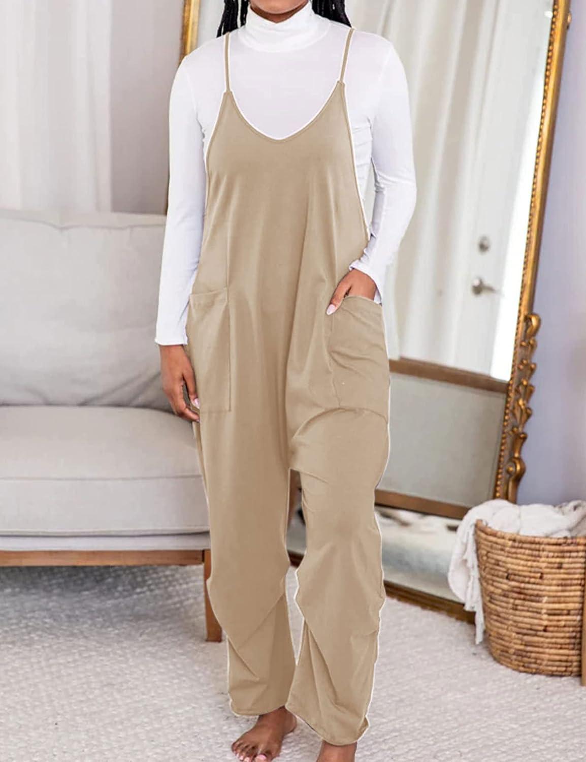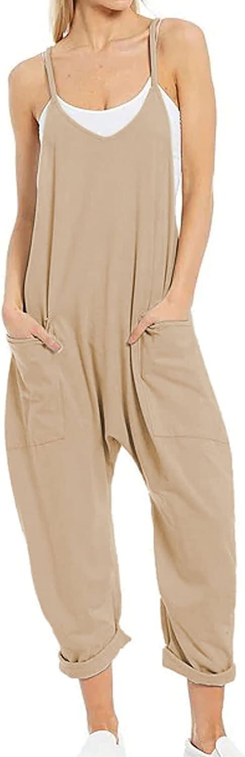we found the relaxed harem silhouette and adjustable spaghetti straps make this romper unusually forgiving — the polyester & spandex blend gives just enough stretch without clinging, and the roomy cut sits comfortably through hips and thighs. As of that generous cut, our fit notes are simple: true to size if you want the classic baggy look; consider sizing down if you prefer a neater, more tailored silhouette. the lightweight construction (about 5.6 ounces) and the deep pockets keep it practical for warm weather, while the V-neck and loose drape make layering or accessorizing effortless.