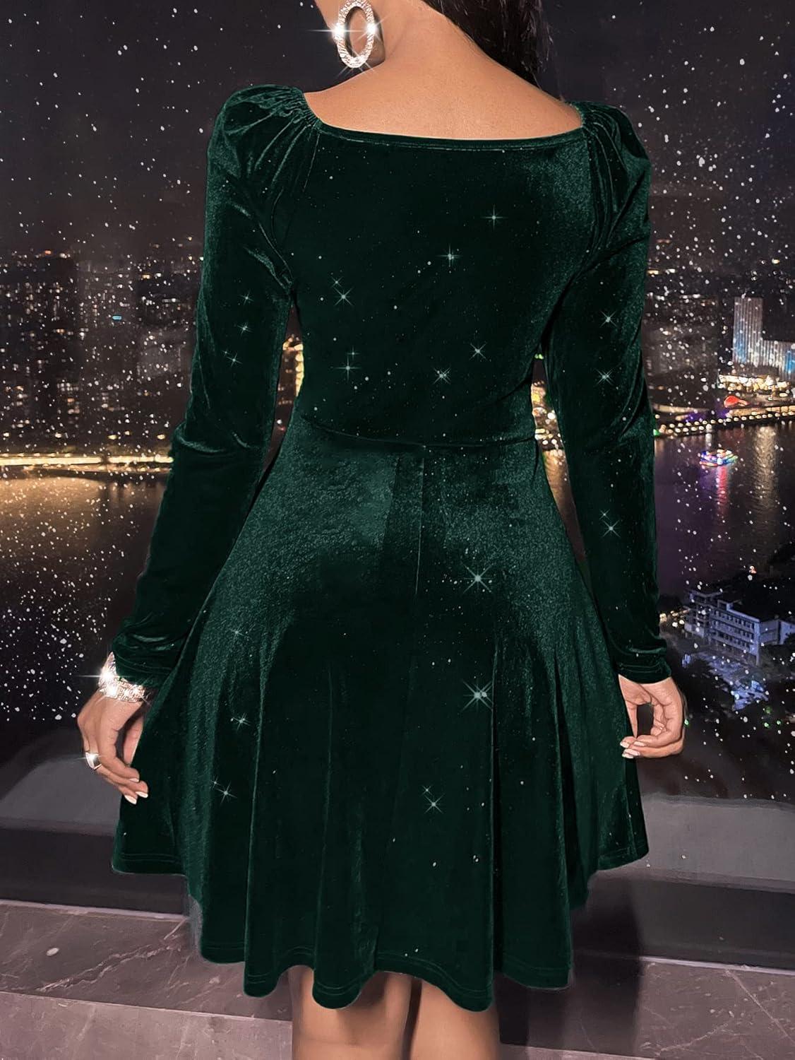 On the dance floor the fit-and-flare shape felt effortlessly playful — the empire waist gave us room to spin without pulling at the torso, and the swinging A-line skims hid any midriff worries while still feeling flirty. The velvet fabric with glitter caught the lights as we moved, and the long sleeves kept things elegant so we didn’t feel overexposed when the tempo dropped. Highlights we noticed mid-dance included: