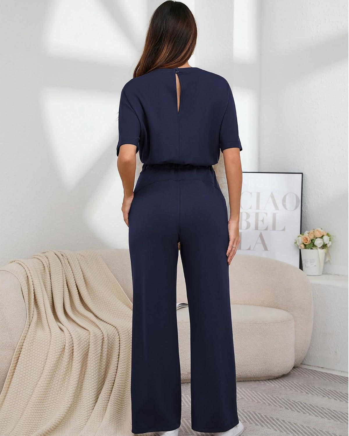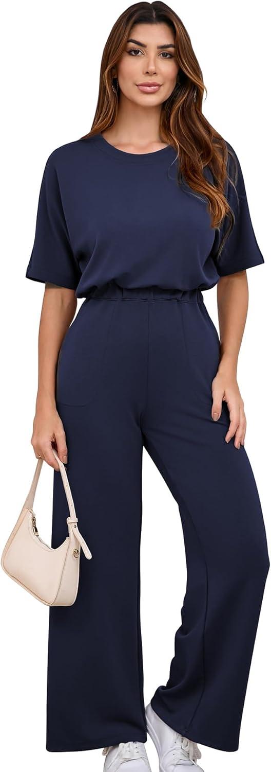 When we tried it on, the short sleeves and wide-leg cut immediately signaled a relaxed, roomy silhouette that lives up to the loose one-piece description — pockets included. The waist sits lower and feels unrestrictive rather than cinched, so we found it cozy for sitting, walking, and layering over a tee or tank. Overall fit leans toward generous rather than fitted, which makes the jumpsuit forgiving across hips and thighs and gives the legs great movement. Our quick takeaways: