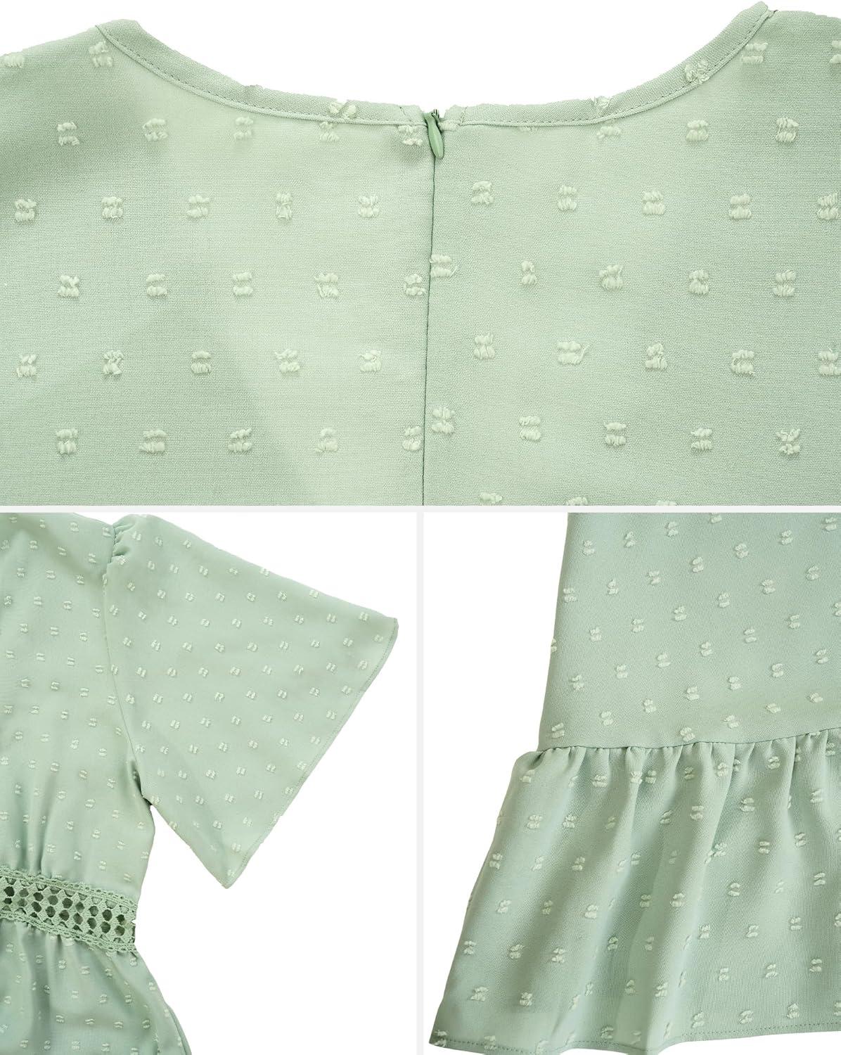 we were pleasantly surprised by how the ruched bodice and V‑neck worked together to flatter our figures: the ruching draws the eye to the center, creating a defined waistline, while the V‑neck visually lengthens the torso so the whole silhouette reads more balanced. The lotus leaf sleeves added a soft, feminine shoulder line that stopped the top from looking boxy, and the tiny Swiss dots gave texture without adding bulk. The mini swing skirt finished the look perfectly—skimming the hips and adding movement so dresses felt flattering in motion rather than clingy when we sat. Our quick takeaways: