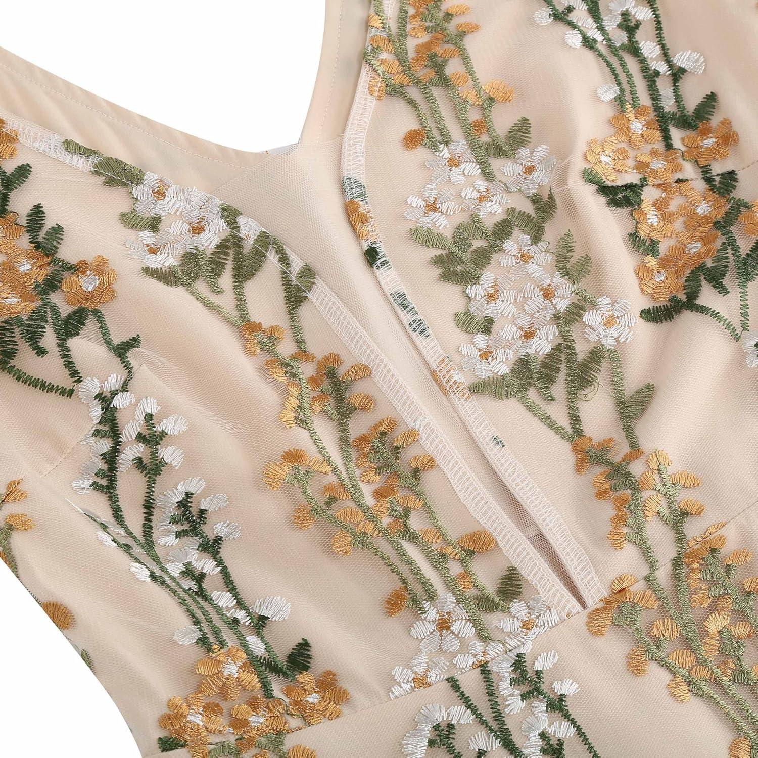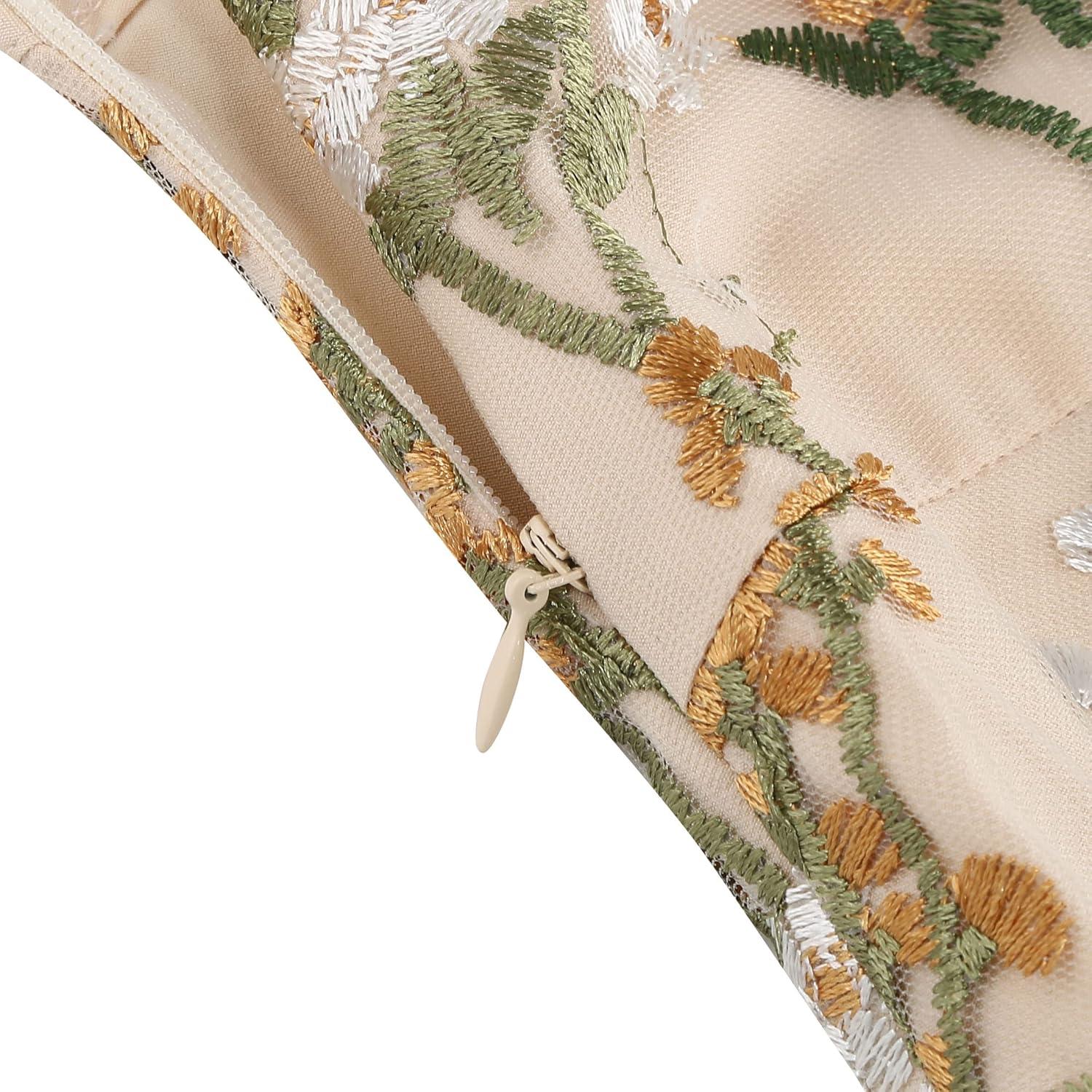 Underneath,the lining contrasts with a smoother,almost satiny hand that sits quietly against your skin; you notice it most where you press, the lining cushioning the embroidered work so you rarely feel the stitching from the inside. From the outside, the floral motifs read as low-relief details: the threads form tiny ridges and layered petals that your fingertips trace, and denser clusters produce a perceptible raised pattern. If you lift a motif to inspect it, you can feel where the stitching anchors into the mesh and where the occasional thread end or knot sits — small, crisp points against otherwise soft fabric. When you move your hand across the dress the combination of lining and embroidery creates alternating smooth and textured sensations, and you might find yourself smoothing seams or flattening a petal to see how it lies after a turn or a swift adjustment.