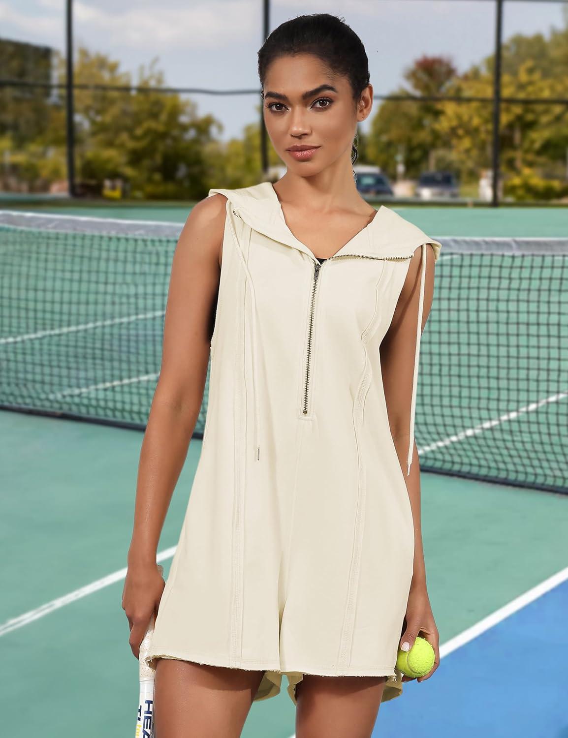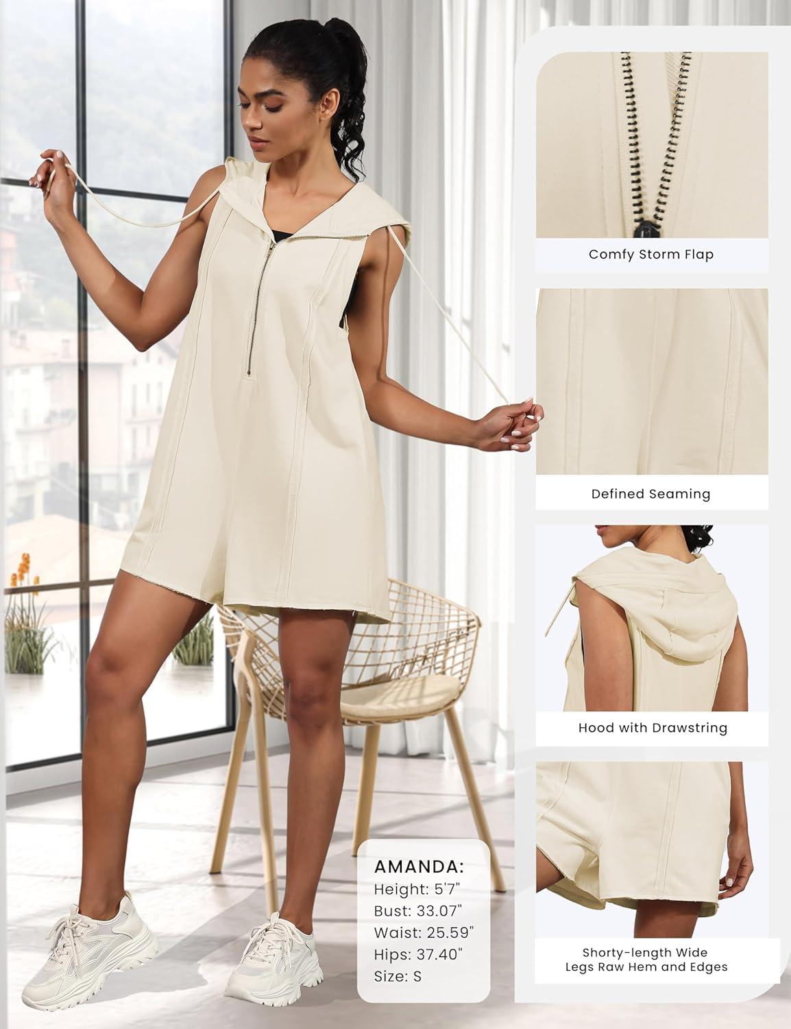 You slip the hooded romper on and the first thing you notice is the soft, slightly brushed interior; the fabric has a midweight give that settles against your skin rather than clinging. It’s listed under the Womens Casual label as “Rompers for Women Athletic workout Hooded Romper Casual Zip-Front Neck Jumpsuits Overalls with Pockets,” but you can think of it simply as a hooded romper. As you walk, the shoulder seams sit flat and the zipfront tracks smoothly, while the body drapes with a modest visual weight that reads relaxed rather than limp. When you sit, the fabric folds into broad, even lines across the thighs rather of bunching, and the pockets introduce a gentle tug at the hips when your hands rest there. The hood keeps enough structure to hold shape without feeling heavy, and those first few minutes make the piece feel quietly substantial and promptly familiar in motion.