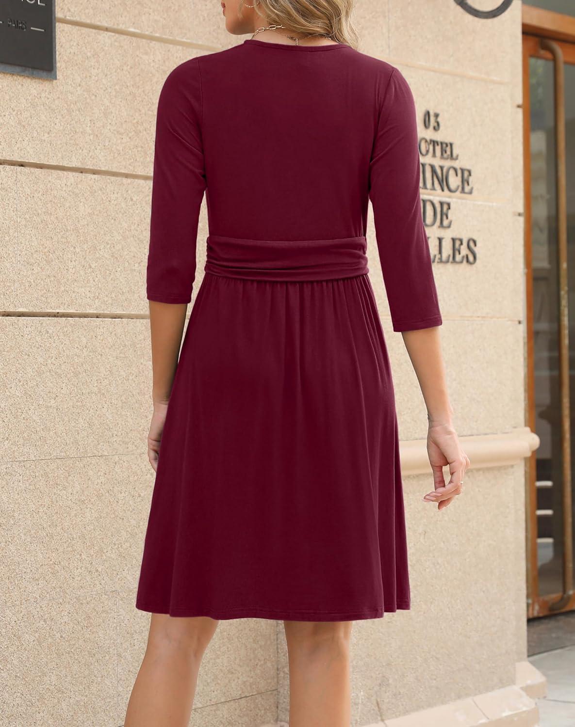 The combination of the wrap V-neck with 3/4 sleeves is complemented beautifully by the pleated A-line skirt that enhances movement and comfort. Beyond aesthetics, functionality is key-the discreet side pockets blend seamlessly into the design and prove surprisingly spacious, easily holding essentials like a phone or lip balm. This thoughtful detail makes the dress practical without compromising its sleek look. Whether dressing up with jewelry or keeping it casual,the fit-and-flare structure pairs well with multiple styles,allowing us to transition effortlessly from day events to more formal nighttime affairs.