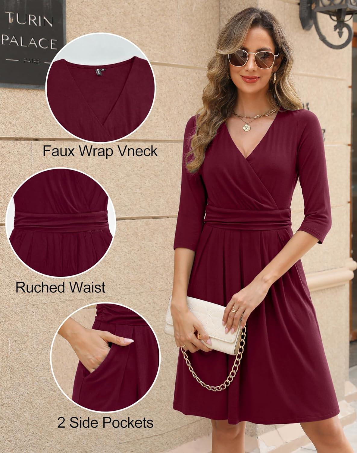 From the moment we unfolded this elegantly designed wrap dress, its blend of soft rayon, polyester, and spandex jersey knit fabric immediatly stood out. The material feels remarkably breathable and stretchy, making it comfortable for all-day wear, whether you’re attending a wedding or a casual cocktail event. The 3/4 sleeves and pleated A-line silhouette create a flattering, feminine shape that moves beautifully with you. We appreciated the thoughtfully placed pockets that are discreet yet deep enough to hold essentials like a phone or lip balm, effortlessly combining style and practicality.