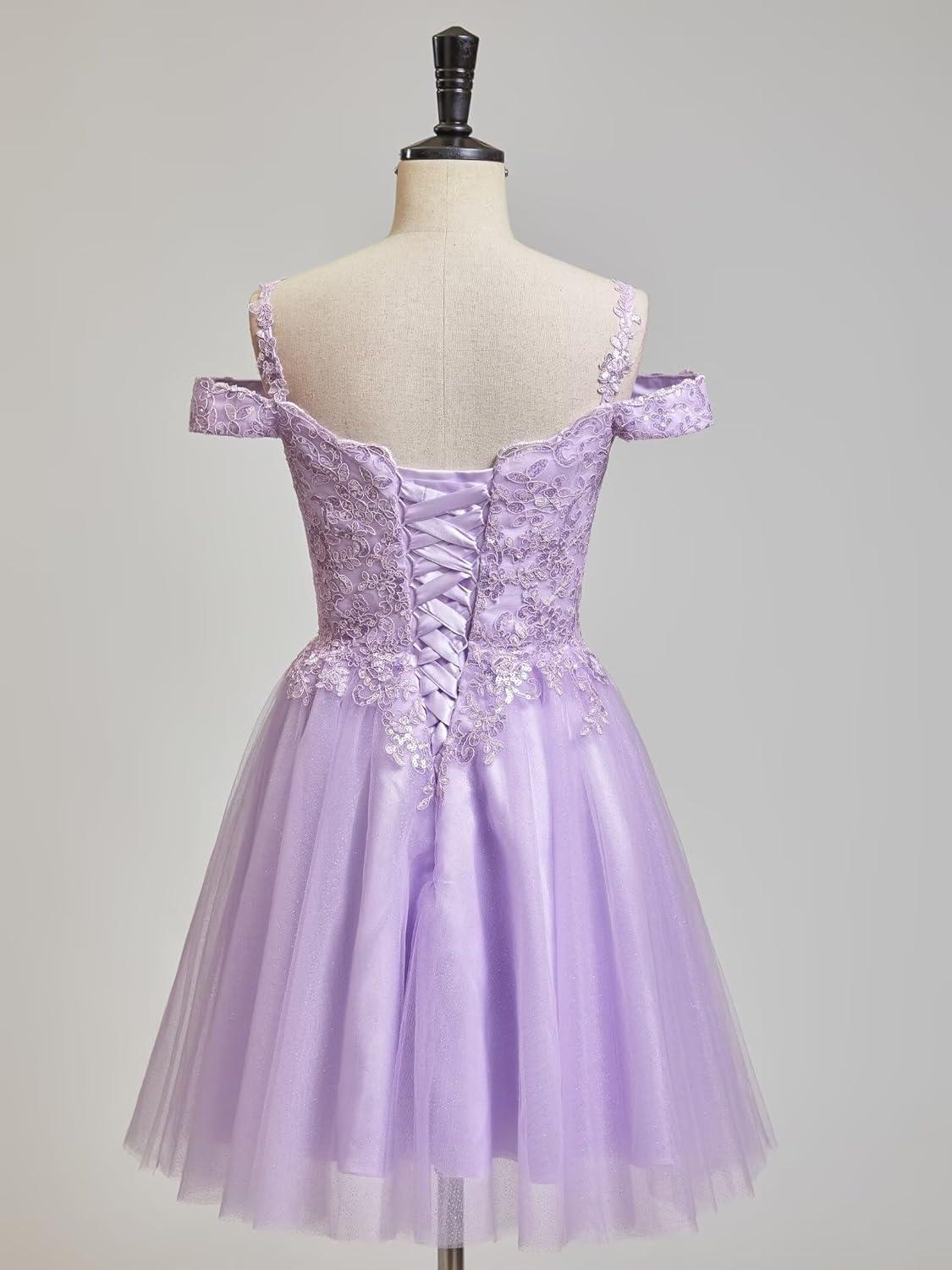 Worn in real time, the gown frequently enough behaves like a piece meant for pulsed movement and photographed moments. The knee-length tulle keeps the skirt from trailing, so the wearer moves through doorways and between groups without fabric underfoot; the sweetheart line and exposed shoulders create a clear frame that shows up steadily in pictures. The lace-up back allows incremental tightening during dressing, and the cold-shoulder cut tends to invite a habit of readjustment—sleeves are sometimes nudged back into place or smoothed after the first round of gestures.