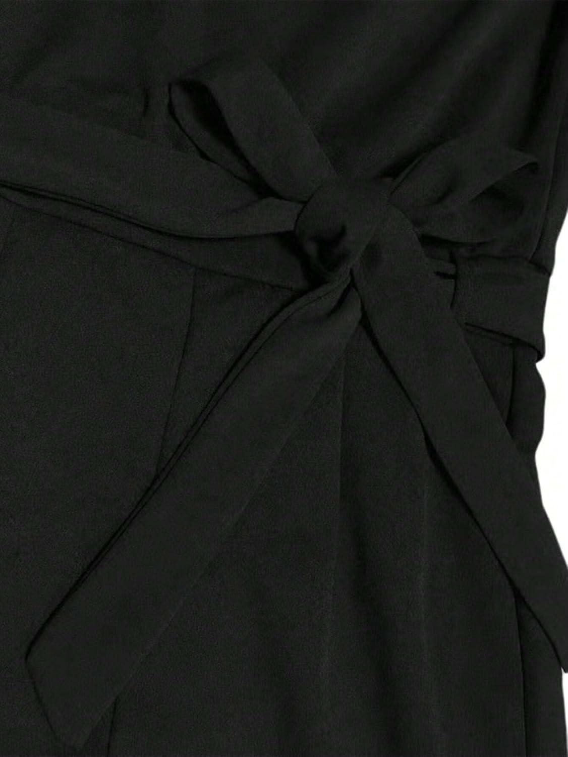 Once you sit, the extra room in the sleeve tends to collapse inward and lay against your upper arm or the side of your torso, and the drape shifts toward the back of the chair.The body of the jumpsuit shifts too; the belt can pull slightly as the torso compresses, which changes how the sleeve falls and sometimes brings the cuff closer to the elbow. If you lift your arms, the sleeve gives plenty of clearance across the shoulder so movement feels unrestricted, though the whole bodice can ride up a little and the sleeve’s inner folds will rearrange—often prompting a quick tug at the hem or a smoothing of the shoulder seam.