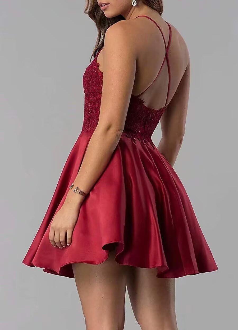 The satin greets your skin cool and smooth, then the beaded lace appliqué interrupts that glide with a faint, reassuring weight as you move. Slip into the ZMX28 Short Beaded Homecoming Dress and the criss-cross straps settle without fuss; the skirt feels light on your legs while the clustered beads give the hem a slow, purposeful swing. When you rise from a low chair the waist seams sit flat instead of digging in, and the side pockets lie discreetly against your hips. Walking, the fabric drapes cleanly rather than clinging, catching soft highlights; sitting, the skirt folds into gentle pleats rather of sharp creases. small details—the way a strap tugs when you reach, the cool of the open-back against your spine—are what shape that first impression.