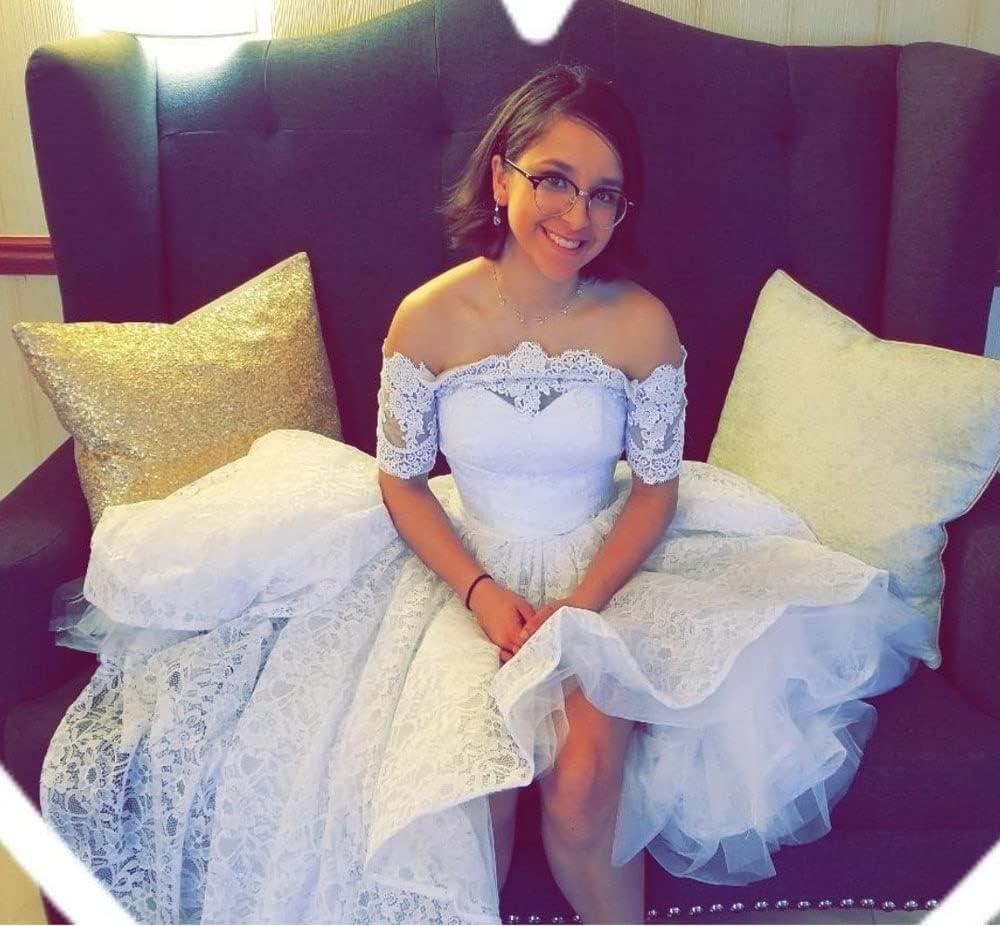 When you move in it the hi‑low skirt breathes with you: the shorter front clears your shoes for easy stepping and the short train skims the floor instead of catching on heels, so you can dance without constantly gathering fabric. The off‑shoulder neckline frames your collarbones and gives a flattering sweep, but expect to hitch the sleeves back into place once or twice if you raise your arms a lot — the lace has some give, not infinite stretch. The lace‑appliqué bodice feels structured enough to prevent major slipping, especially if you choose the lace‑up back over the plain zipper; the lace‑up lets you cinch more precisely so the gown stays where you put it.